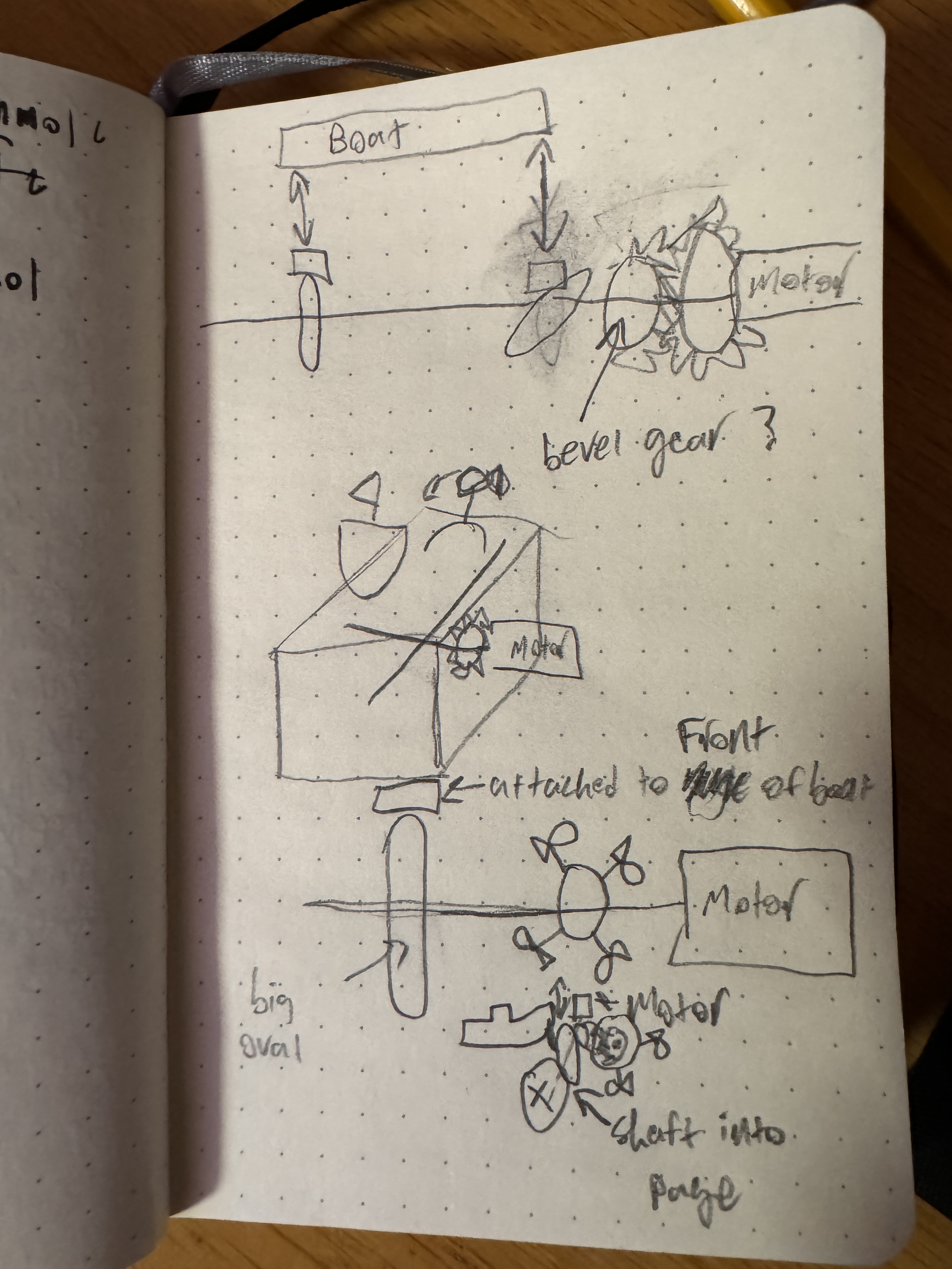 Mila's Stormy Seas, I decided that I wanted to make a boat rocking on the high seas as at least part of my project. My original idea for this was to have two CAM systems on either side of a cardboard cutout of a front view of a ship, where the CAMs were ovals that were offset by 90°, so the sides of the boat were rising and falling in an offset way. However, just having the boat wasn't enough for me - I wanted to see if I could add a bit more. I was thinking about maybe having the fluke of a whale appear and disappear to be a whale sighting off of the boat, but I figured that would probably just be another CAM system, which is lame. I wanted to see if I could spice it up a bit. That got me thinking like maybe flying fish, but I didn't think those would look good as a side profile, so I eventually settled on dolphins jumping out of the water. I thought that the best way to accomplish this would be to have four dolphins mounted to a circle that is just spinning, attached to the main crankshaft (for lack of a better word) via a gear. However, to make it visible from the front, it wasn't going to work out with the current orientation of the boat without the use of bevel gears, which I wasn't sure that my cardboard and wooden dowel construction would have the tolerances or structural integrity for. Because of this, I pivoted to a side view of the boat that pitches forwards and backwards via one CAM system attached to the front of the boat and the main drive shaft. I figure that my dolphin apparatus is now in the correct pivoting orientation to spin in the same plane as the boat instead of perpendicular to it, but it will need to be attached via gears. I have attached my very crude brainstorming sketches below, but they probably only make sense to me.