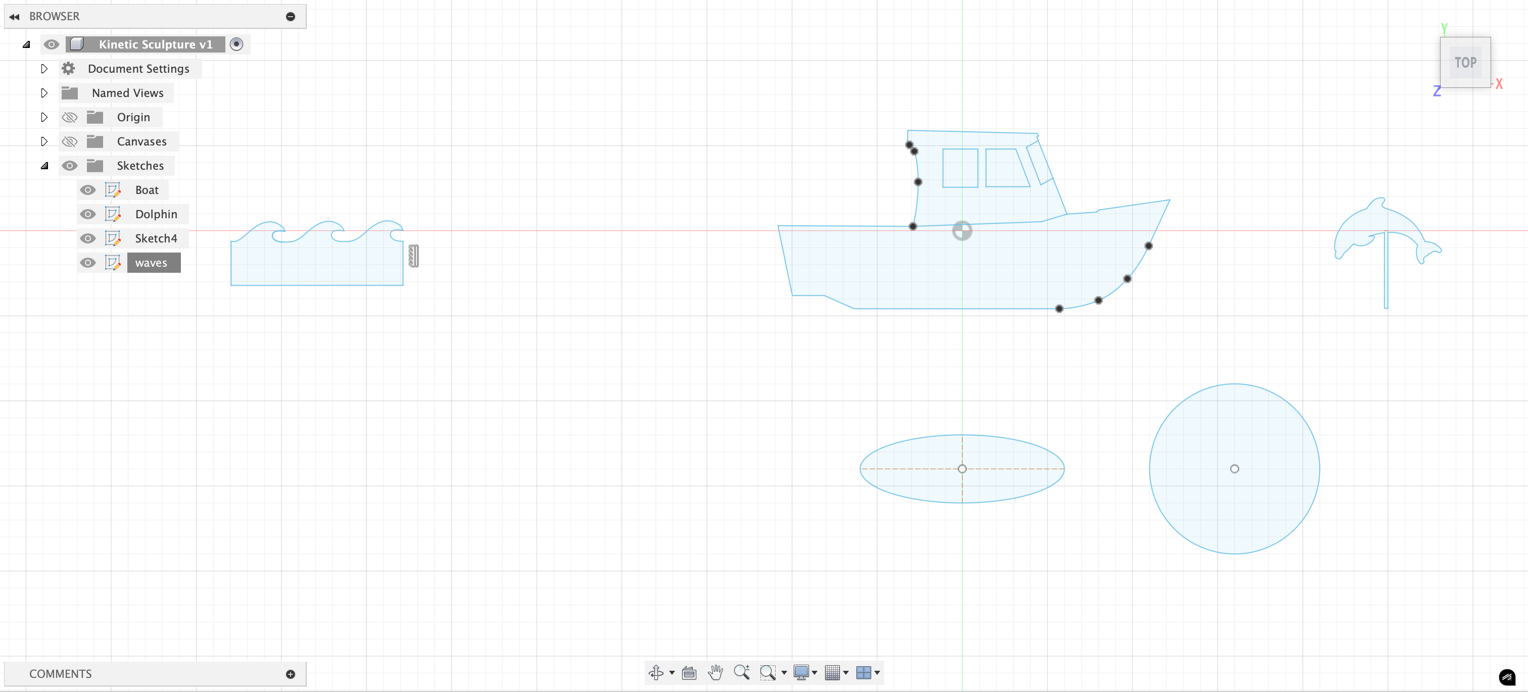 After deciding on the general premise/design that I wanted, I began designing some of the key components in Fusion. I brought outlines of a cartoon boat and sketch of a dolphin into Fusion as canvases, and then painstakingly traced them to the best of my ability using the spline and line tool. Moral of the story - those drawings were curvy af and that made it very tedious to accomplish this seemingly simple goal. Luckily with some good music, it went by quickly. I also figured I might want some waves as a part of this design, so I did the same thing where I brought a sketch into Fusion and traced it. At this step, my goal was mostly just to get these sketches made because I think this will be a time consuming step. I'm guessing these designs will change slightly as I go along and figure out how I am going to attach everything, but I feel like this is an important step. I also am somewhat scared of the next steps, so I might try to do those in office hours or something.