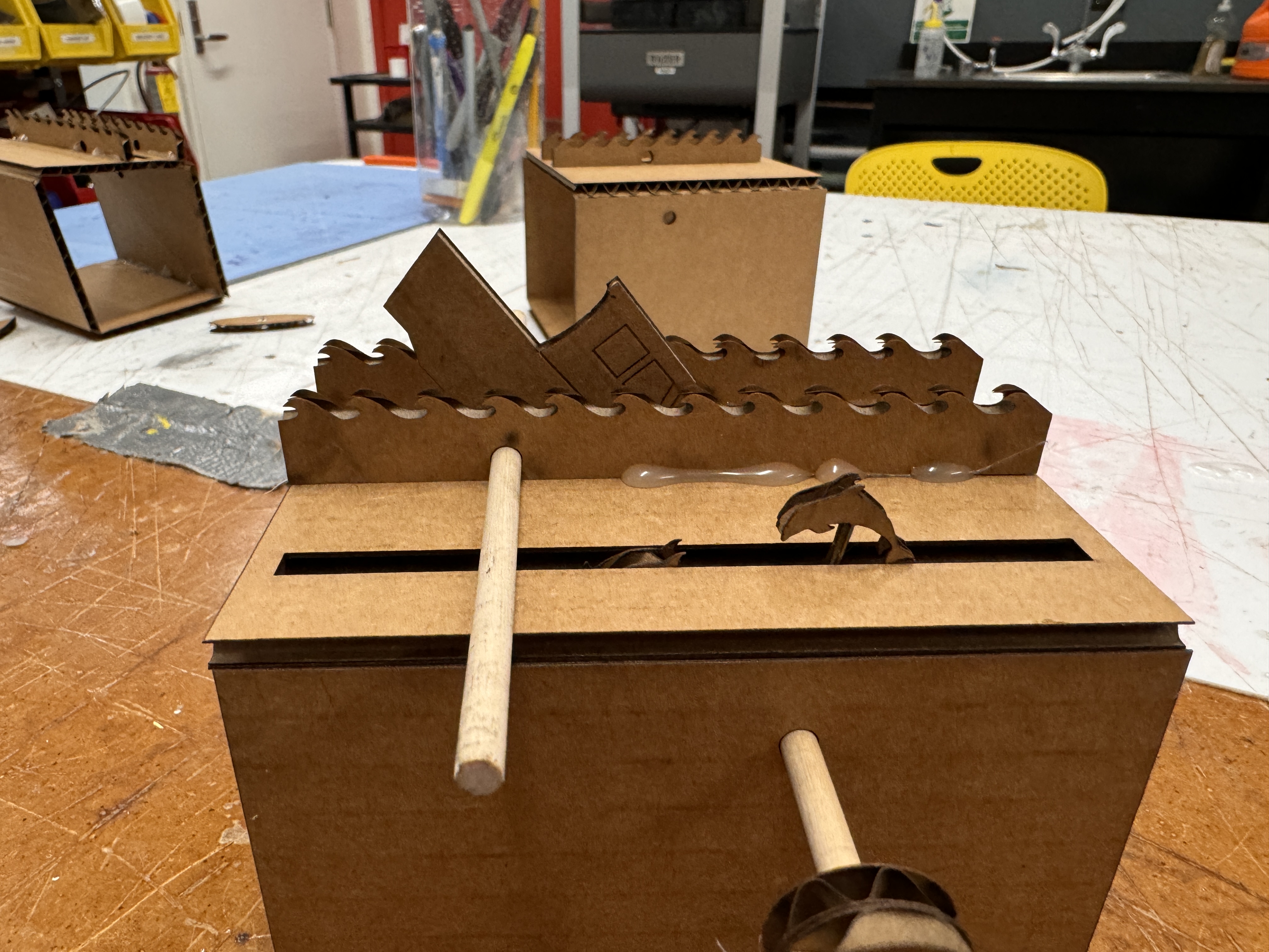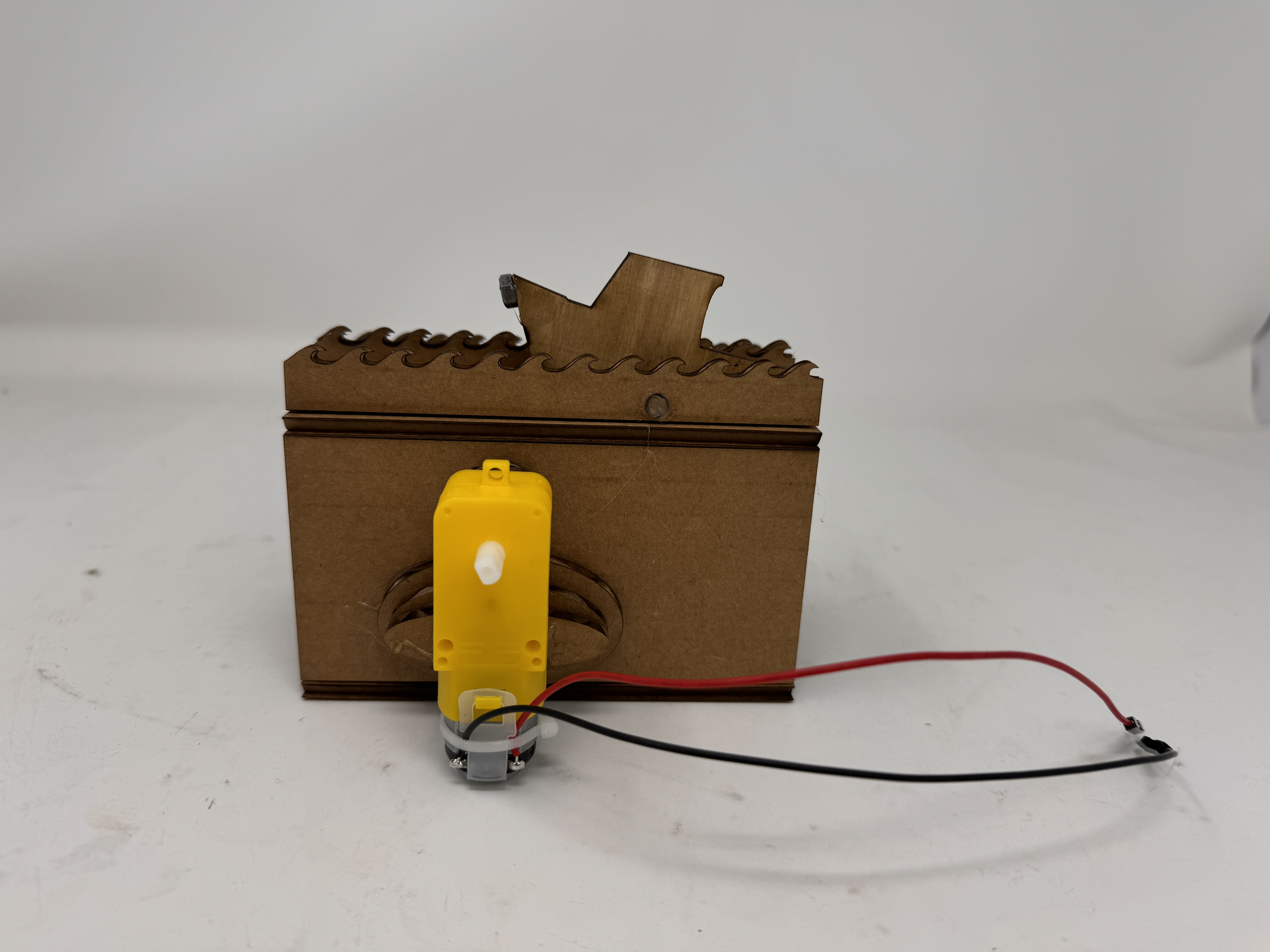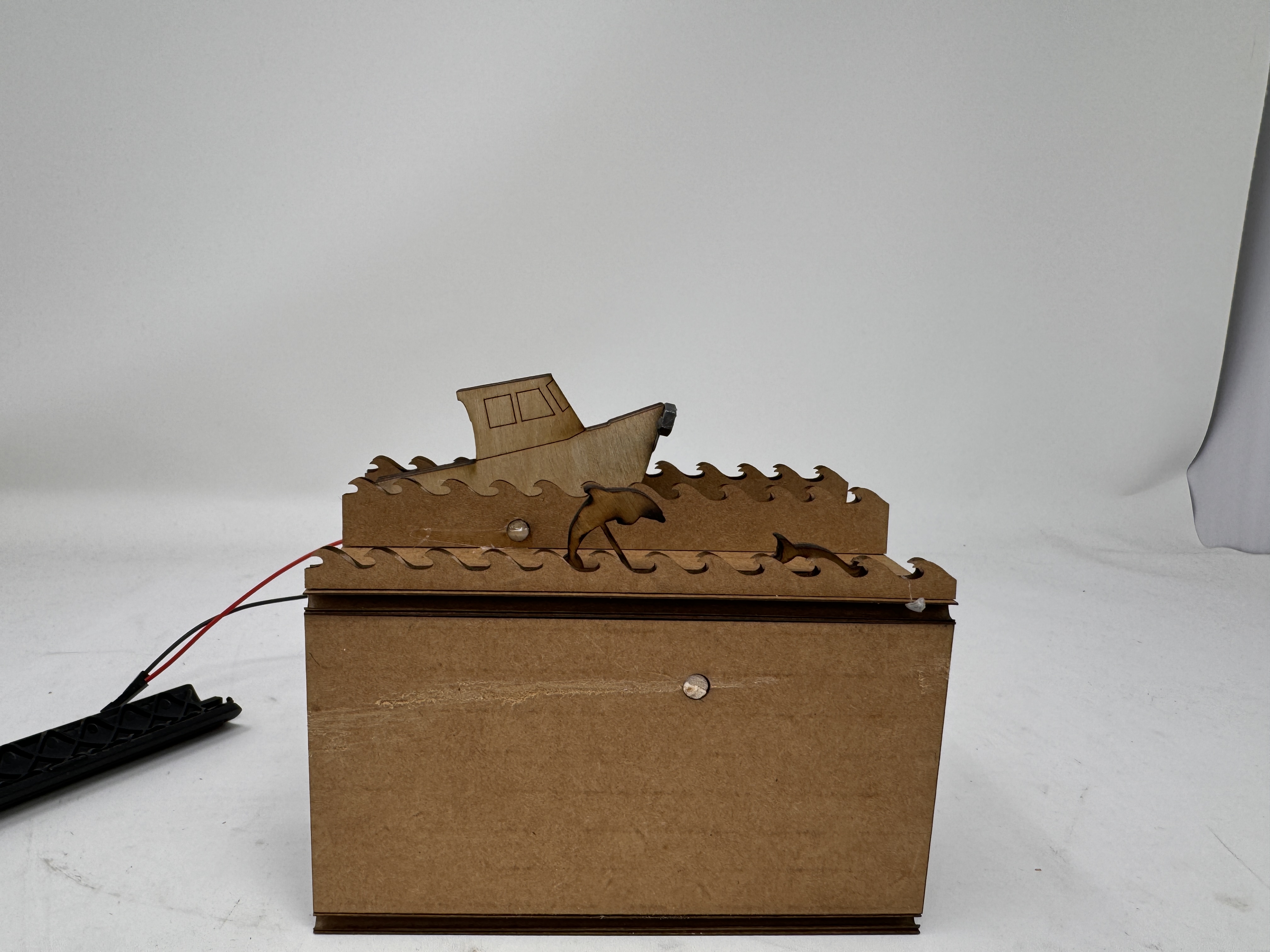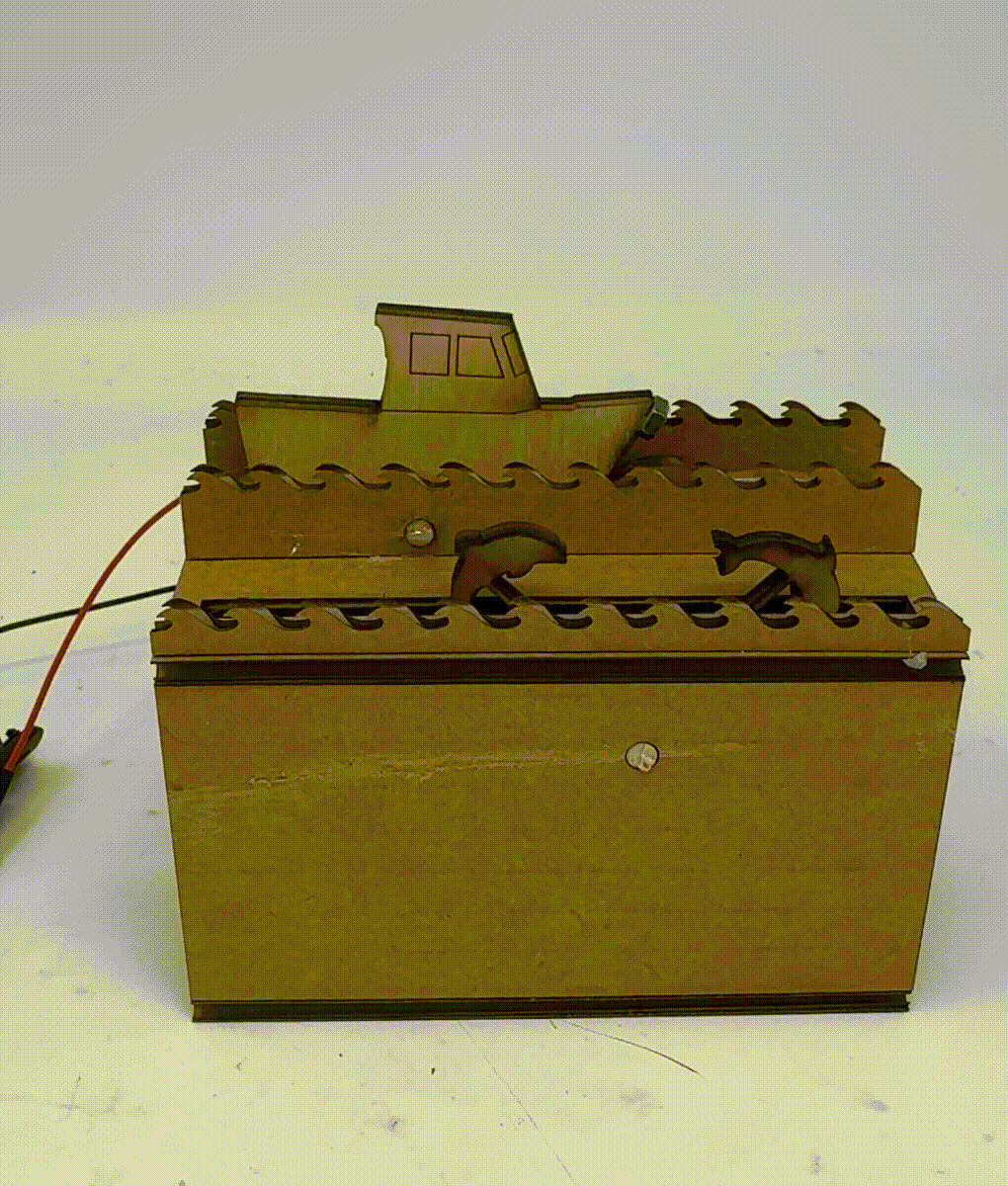 This was encouraging because it like kinda worked, but still a work in progress. The dolphins were too small, the CAM system was still not quite the perfect dimensions, and the mounting point on the waves was off. I fiddled with placement of the hole on the waves by using the heat gun to move the waves around until I found a good pivot point and measured that location of the hole. I reprinted a new CAM and dolphin setup, and it was all really coming together! The new CAM was spot on, and the dolphins were just too big, but I knew the exact measurements, so I was ready to print the final iteration. I printed everything except for the boat and dolphin in cardboard because I honestly like the aesthetic of it. I needed to reprint the box because I needed to make the slits wider to account for wooden dolphins and boat, as well as a few other minor tweaks. I then printed the boat and dolphins on plywood, half because it looks cool and half to give the dolphins a little more structural integrity on the thin post attaching it to the circle. I put it all together with copious amounts of hot glue, and it looked great! I'll dive into all of the features below, but one problem that I did run into was that for some reason the wooden boat wasn't pitching forward as well as the cardboard one. I originally glued a nut onto the back of the nose of the boat so that it wasn't visible, but that threw off the balance of the pivot point, meaning that the boat would always get stuck on the slit when it was rotating. To counteract that, I hot glued the nut onto the side of the plywood, which doesn't look as nice, but I think of it like a figurehead - maybe I could 3d print something to replace the nut eventually. This works perfectly though to weight the nose, causing it to bob with the CAM and not causing it to go off the rails. I also mounted the motor using scrap cardboard and some hot glue, which isn't the most elegant solution, but it sure did work. Some pictures of the final product below!