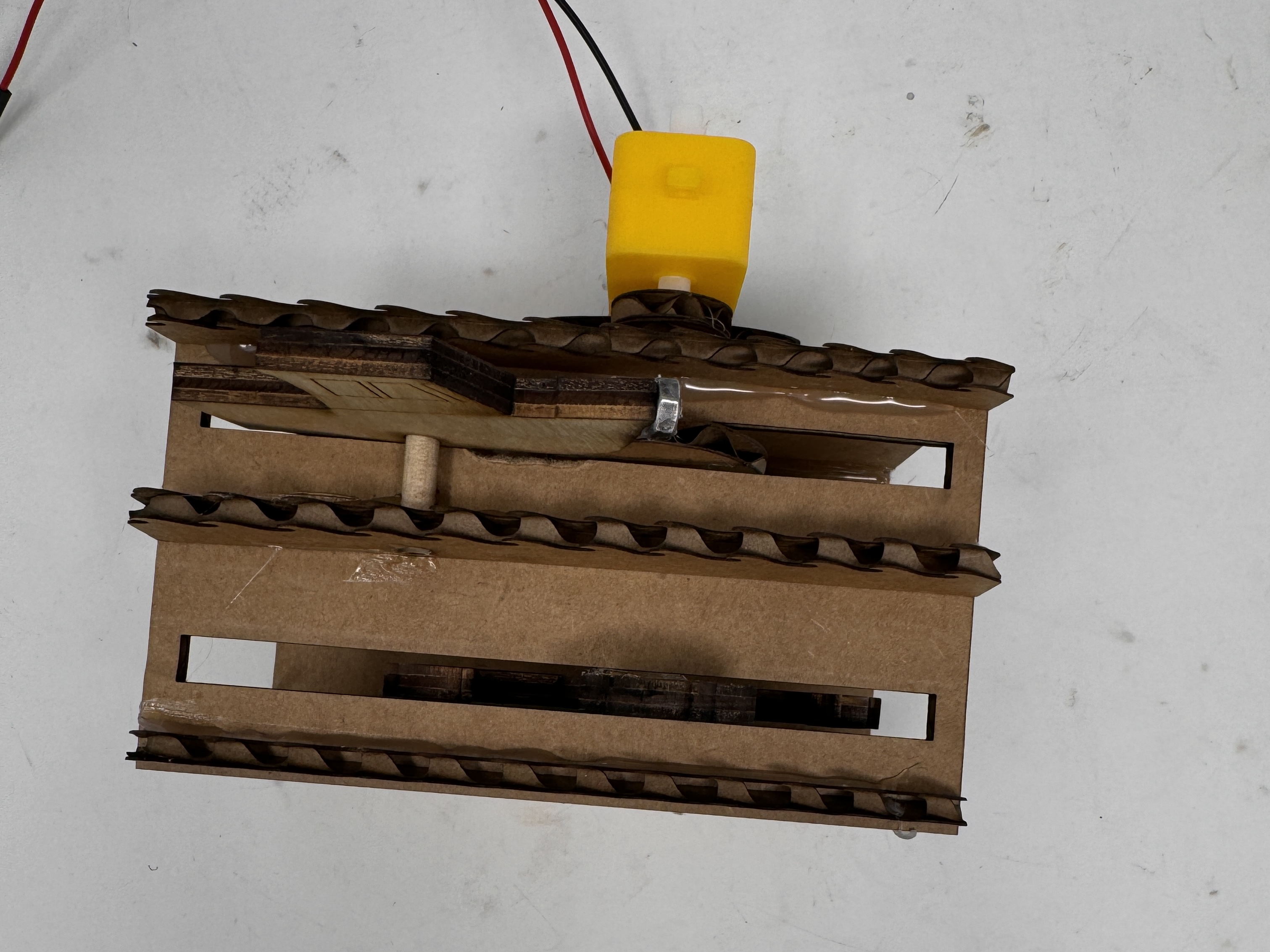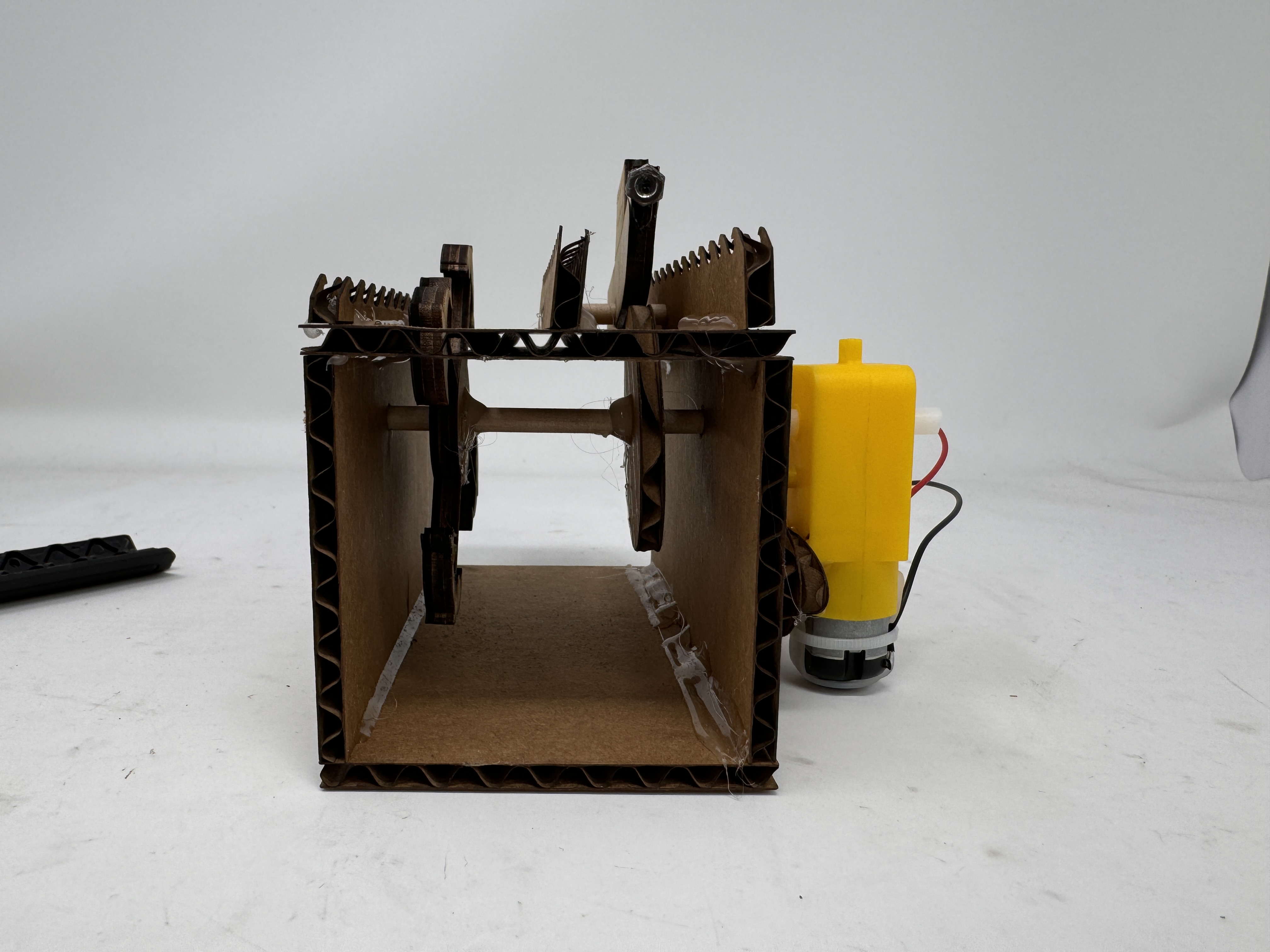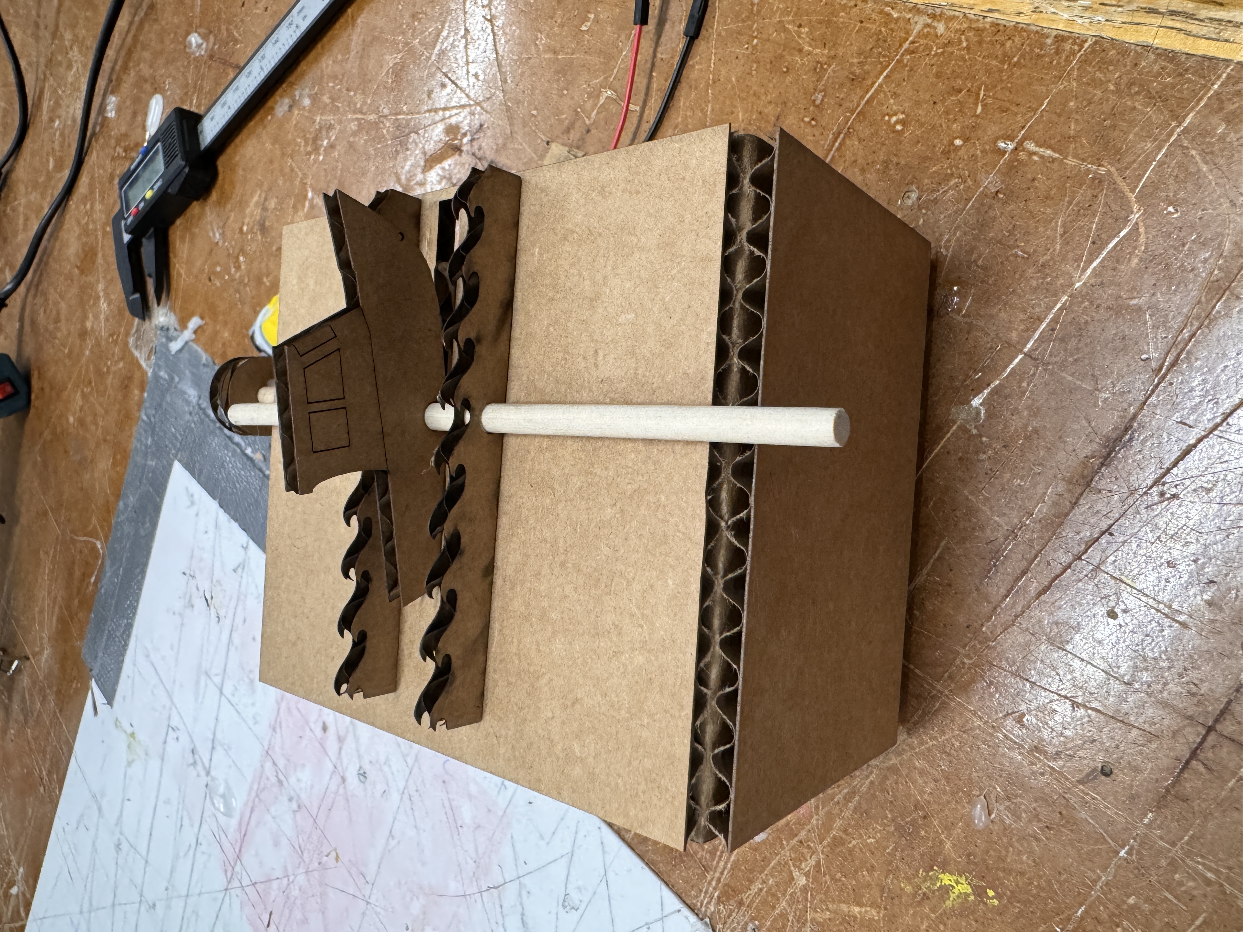 - A mount for the motor that consists of two pieces of cardboard, one which connects to the motor, and one that connects to the dowel that are then hot glued together to allow for transfer of movement from the motor to the dowel