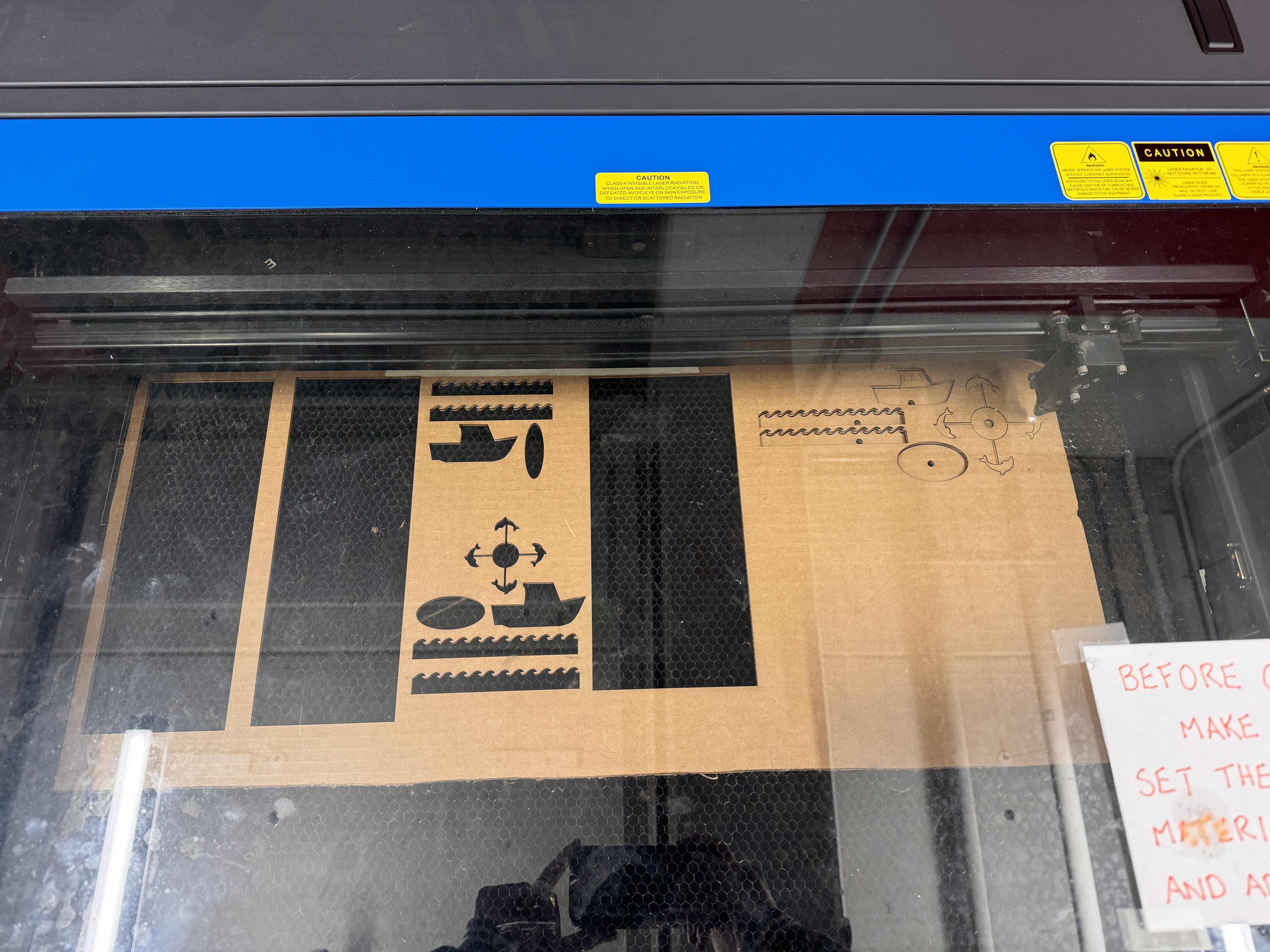 Honestly, all things considered, this wasn't that bad, other than the fact that I only added one hole to the box, so the dowel couldn't go all the way through. My spacing of everything was also way off - the CAM was way too long on the major axis and way too small on the minor axis, the boat was too close to the axis of rotation, the boat sat way below the waves when looking at it horizontally, and the motor attachment point was too far off the ground. Though, my motor mounting system did seem to be spot on. I had two circles of cardboard, one with a circle cutout that I hot glued to the dowel, and one with a square hole that was hot glued to the other one and meshed with the motor. This allowed the motor to turn the one with the square hole, and it transferred that to the dowel. My original plan was to have a wire or something else like that attach to the nose of the boat and attach to the CAM, but with this iteration I realized that it honestly might be better to just have the CAM interact directly with the boat. The oval structure could just push the nose of the boat up and down directly without the need for another mechanical connection that would be flimsy and could easily fail. To counteract the fact that the push and pull point won't be all the way at the nose, I moved the pivot point back on the boat so it was front heavy and would sink when it was resting along the minor axis of the CAM. I went back to Fusion, armed with a sweet pair of calipers, to set this all right. After significant tweaking and iterating, I was ready for my next prototype. Again, it fell short and the slot was the wrong dimension, the waves were still off, the scoring and breaking of the cardboard to fold it into a box wasn't looking good, and more. I decided to just try to address the wave issue first as I could easily prototype those and just remove the hot glue with a heat gun and eventually got them to a place where I was happy about them. For my third iteration, I felt that I had gotten the boat to a good enough point where I was ready to start considering the dolphins as well. By this point, it was already like 8, and I was tempted to just ignore the dolphins and be content with the boat bobbing up and down, but that wasn't enough for me. I knew that I would go home and toss and turn in bed knowing that I could've added dolphins to my kinetic sculpture but didn't because I wanted it to be done. Therefore, I persevered and continued prototyping. I made the box wider to account for the dolphins and made the waves span the whole box, and I realized that I didn't really need the dolphins on a gear system since the boat was already pretty offset from the drive axis. By having the boat interact with the CAM directly, I also was able to have the driving dowel close to the top of the box, which also meant that I could just directly connect my dolphins to that dowel, as the distance that they would need to be to be seen from the axis was less than the distance from the axis to the bottom of the box, so I could just mount them directly on the axis and have them spin with the motor and driving motion. I attached the one dolphin that I had to a circle in Fusion, and then used the circular pattern tool to put 4 onto one circle with a cutout in the middle to fit the dowel. I printed this out and put it all together with the new dimensions. Here is my first iteration of having the dolphins on the box, along with my two non-dolphin attempts in the background, as well as a peek at all the laser cutting I was doing.