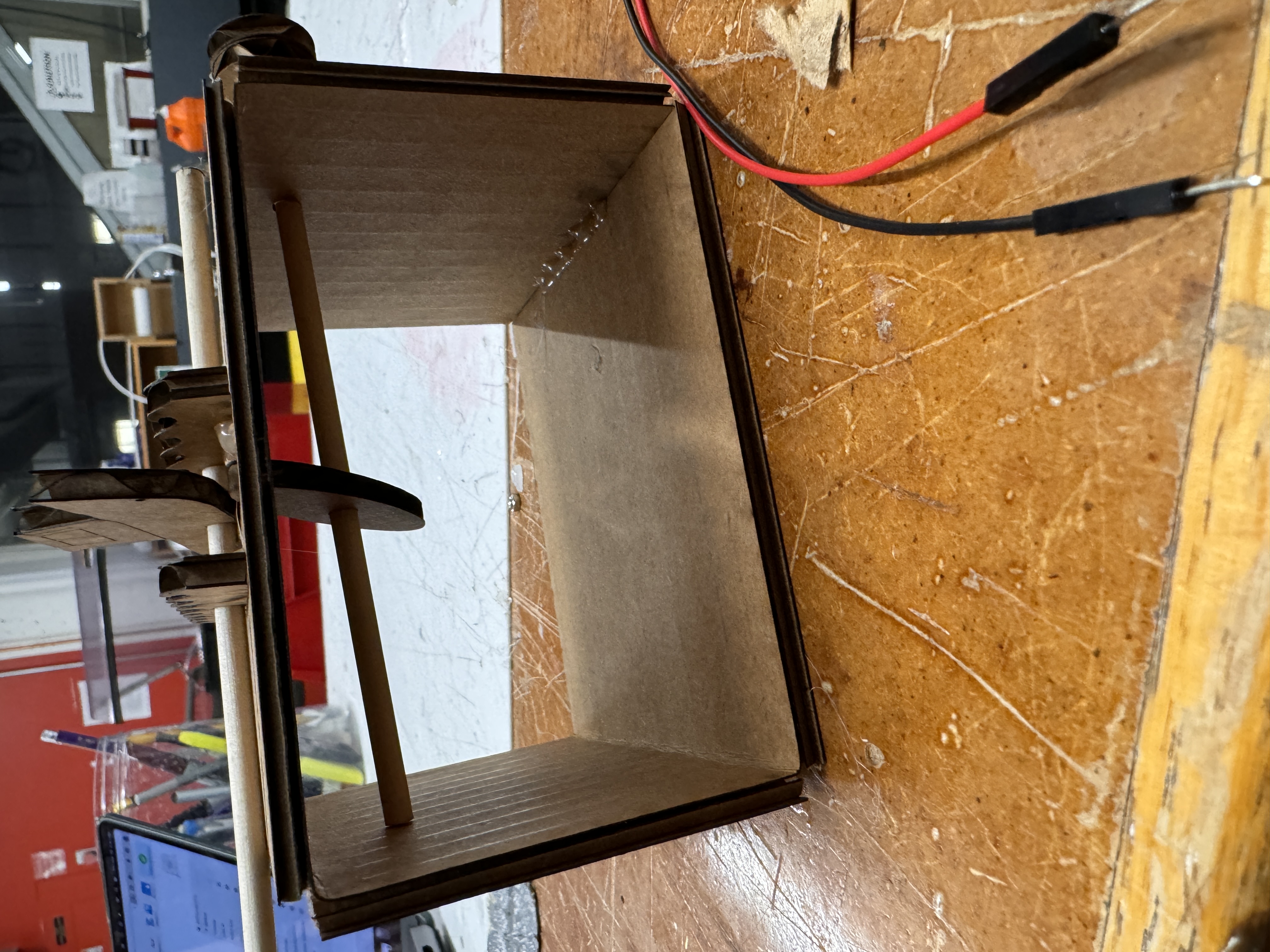 - A box to house everything that has the motor mounted via hot glue on the back of it!