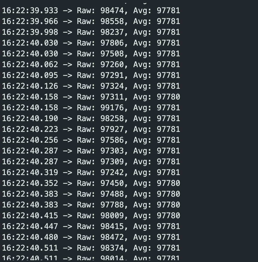 To counteract that, I made it also print out a rolling average to get a clearer picture of what the baseline capacitance was.