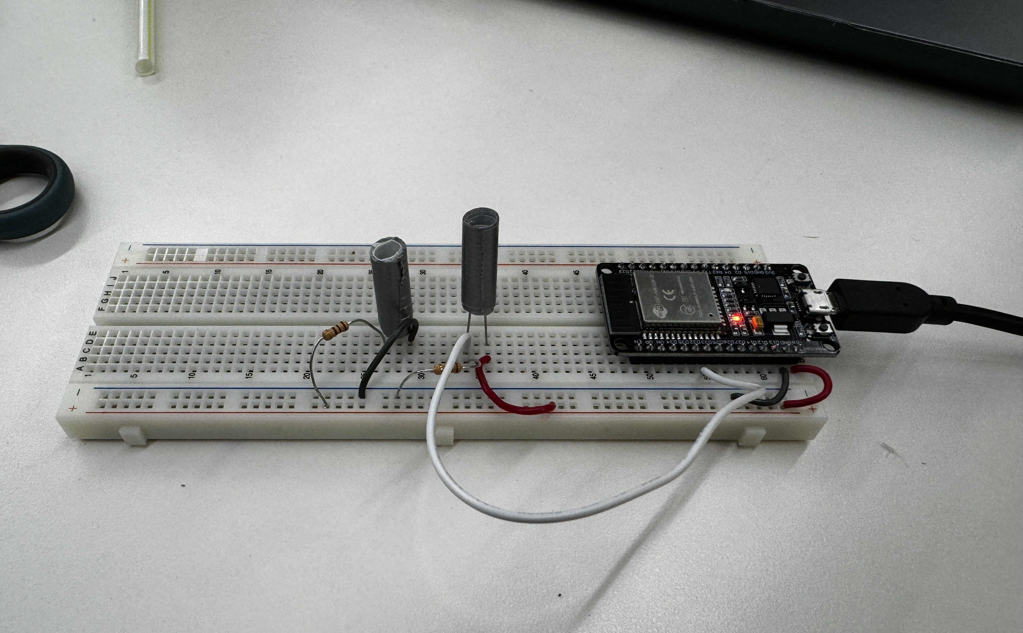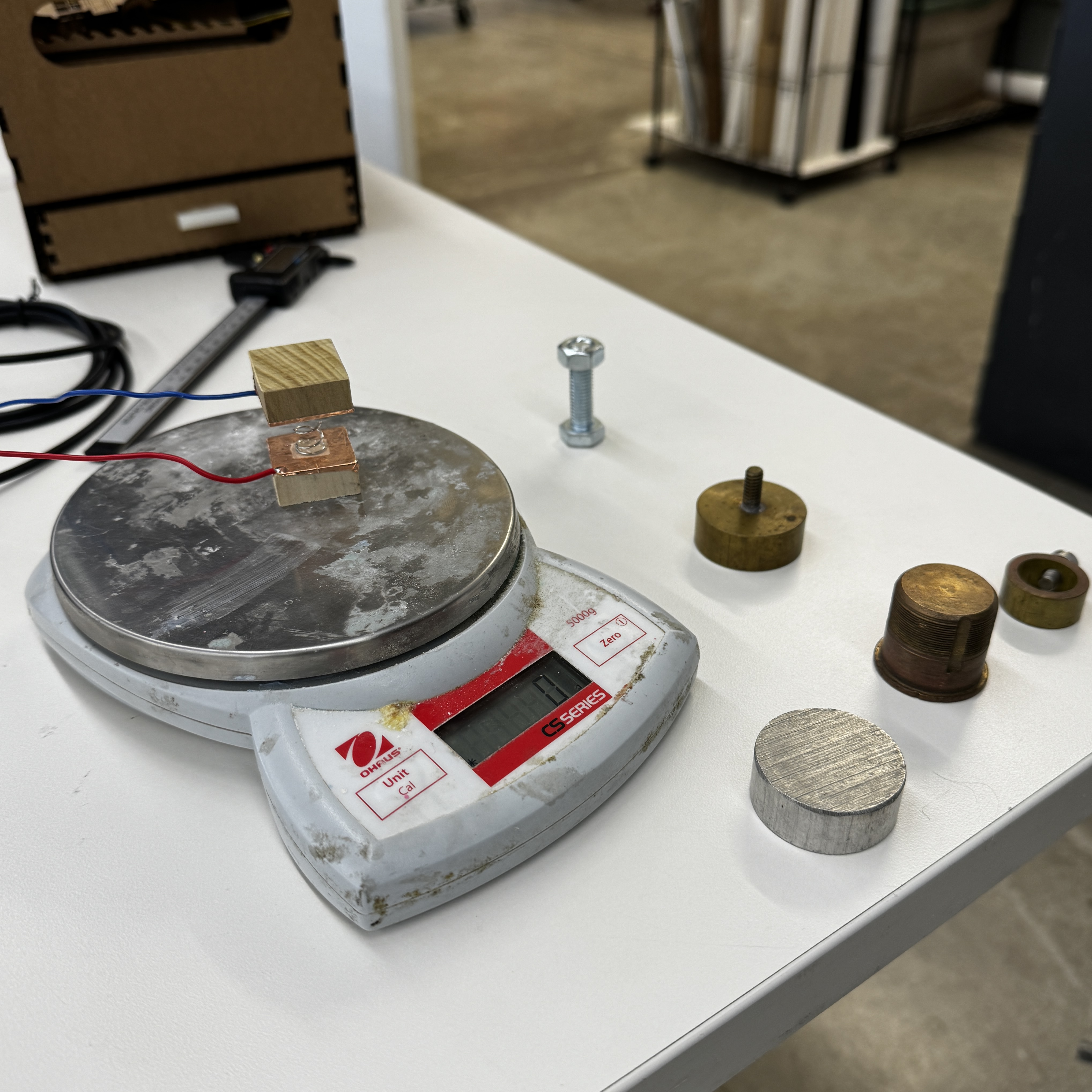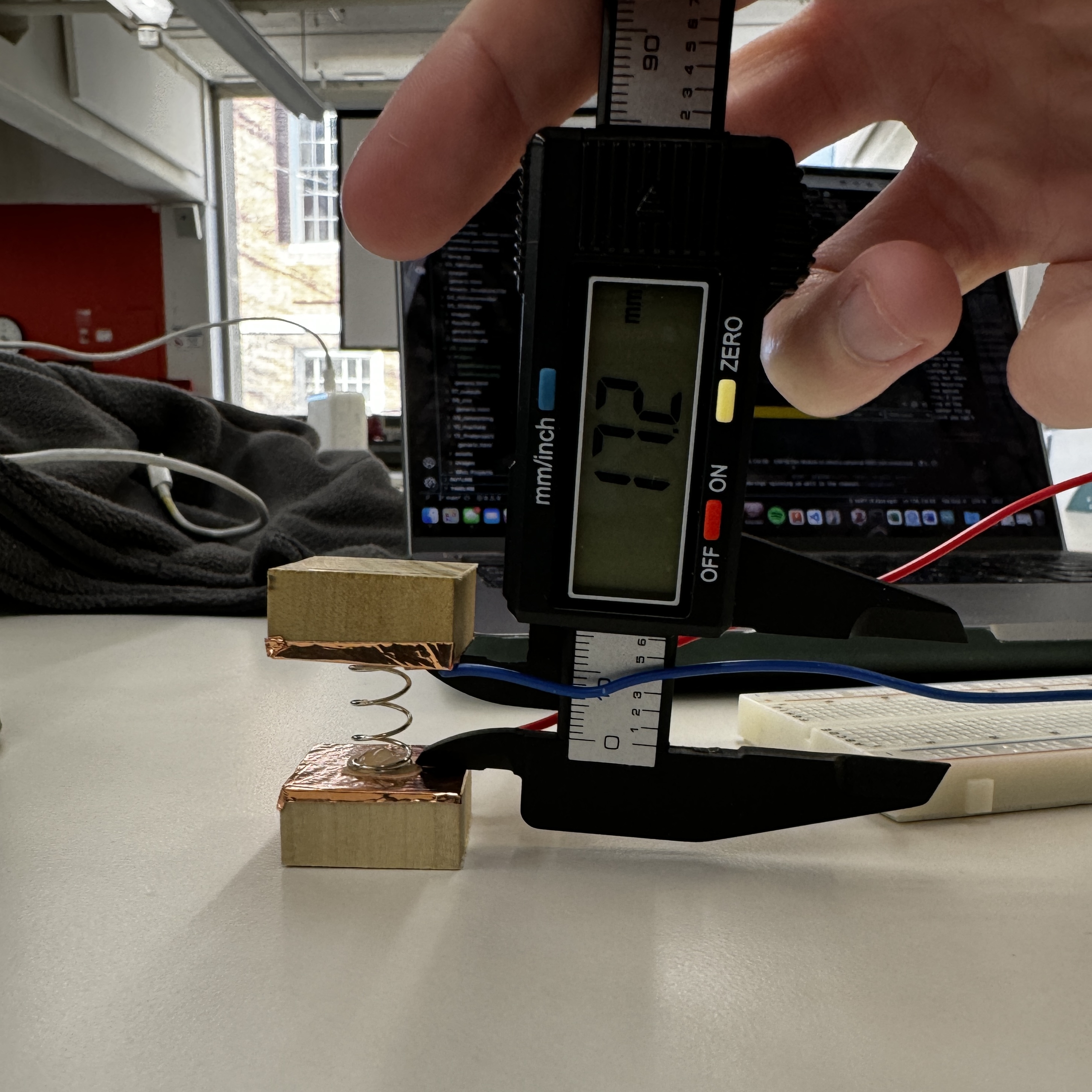 Essentially, I used the equation for capacitance combined with the equation for the force of a spring to get it into this nice(ish), usable form that expresses force as a function of capacitance. I knew that I could find the spring constant, which made this whole thing solvable. After proving to myself that this was solvable, I went about setting up all the necessary components and measuring the required variables. I calculated the spring constant by putting heavy objects of a known mass on top of the spring and measuring the compression of the spring. After doing this for a couple objects, I averaged across the found constants to get the k that I eventually used. After that, I got some copper, cut it into little squares, and adhered them to little scraps of wood that I found in the lab. This gave them a little bit more structural integrity and a better shape for when I later was putting heavy objects on it. I then hot glued the spring onto non-conductive pieces of tape that I placed on the center of the copper pads and created the full force sensor itself. I also soldered some wires onto the copper pads. Initially, I used the code that we had in class to measure the capacitance, but there was too much variation and my sensor was producing a sinusoidal result instead of a clear baseline.
