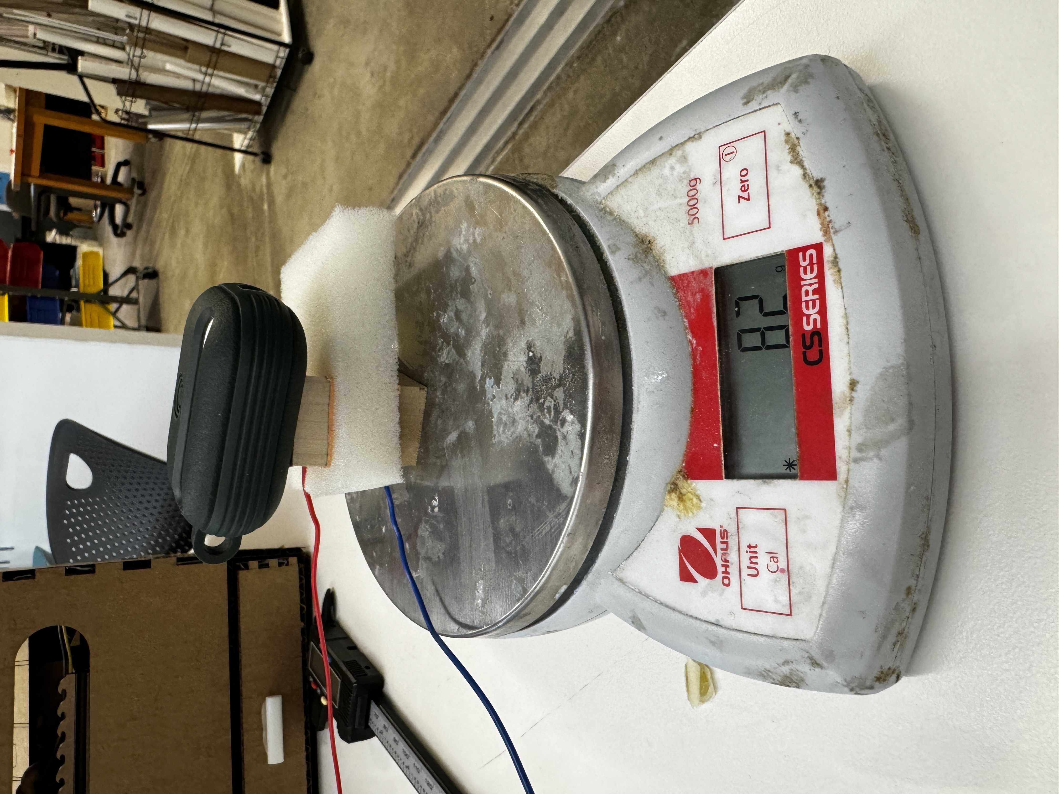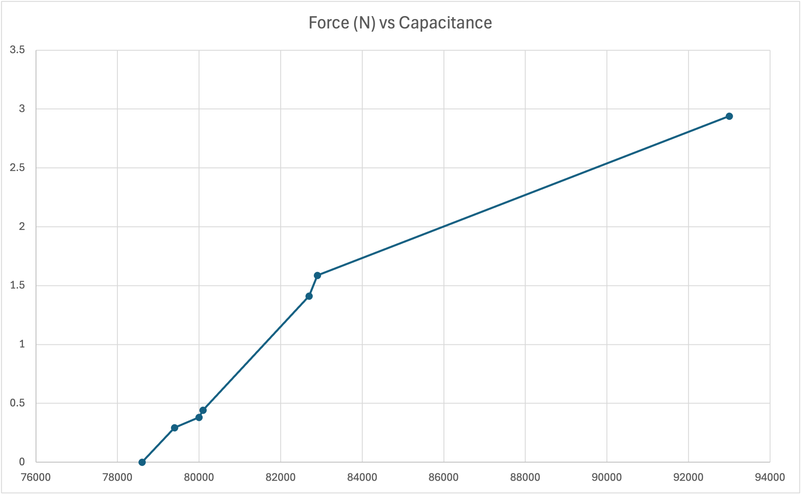 After a few of these, I figured I probably should actually implement my formula that I painstakingly derived, which is when disaster struck. I typed in my formula painfully slowly into Arduino, ensuring that all the parentheses were in the right place. I took the baseline capacitance and all of the other physical properties that I measured and put it into the code and ran it, and...I got some weird results. No matter what, despite the capacitance changing, the force kept reading 23.65 N. I had been very careful with my units, but I figured I should double check them. This is when I realized that my baseline value of 97,881 is likely not measured in Farads... Upon talking with Bobby and Kassia, I realized that my grand dreams were dashed because the value measured by arduino is somewhat arbitrary and not actually something that has well defined units. Because of this, my entire idea is moot. I never considered that I wasn't actually measuring capacitance, and this new revelation made my equation unsolvable. If we had measured capacitance directly, this would've been a sick idea. With dreams dashed, I ripped the spring off the copper pads and stuck a random, lame piece of foam between them instead. I could've continued the process with my spring contraption, but balancing the weights on top of it was a nuisance that I was only willing to put up with if it was going to add a cool aspect to it. With the foam newly between, I went on with putting heavy objects on top and measuring the capacitance. I eventually created the force vs. measured value plot below