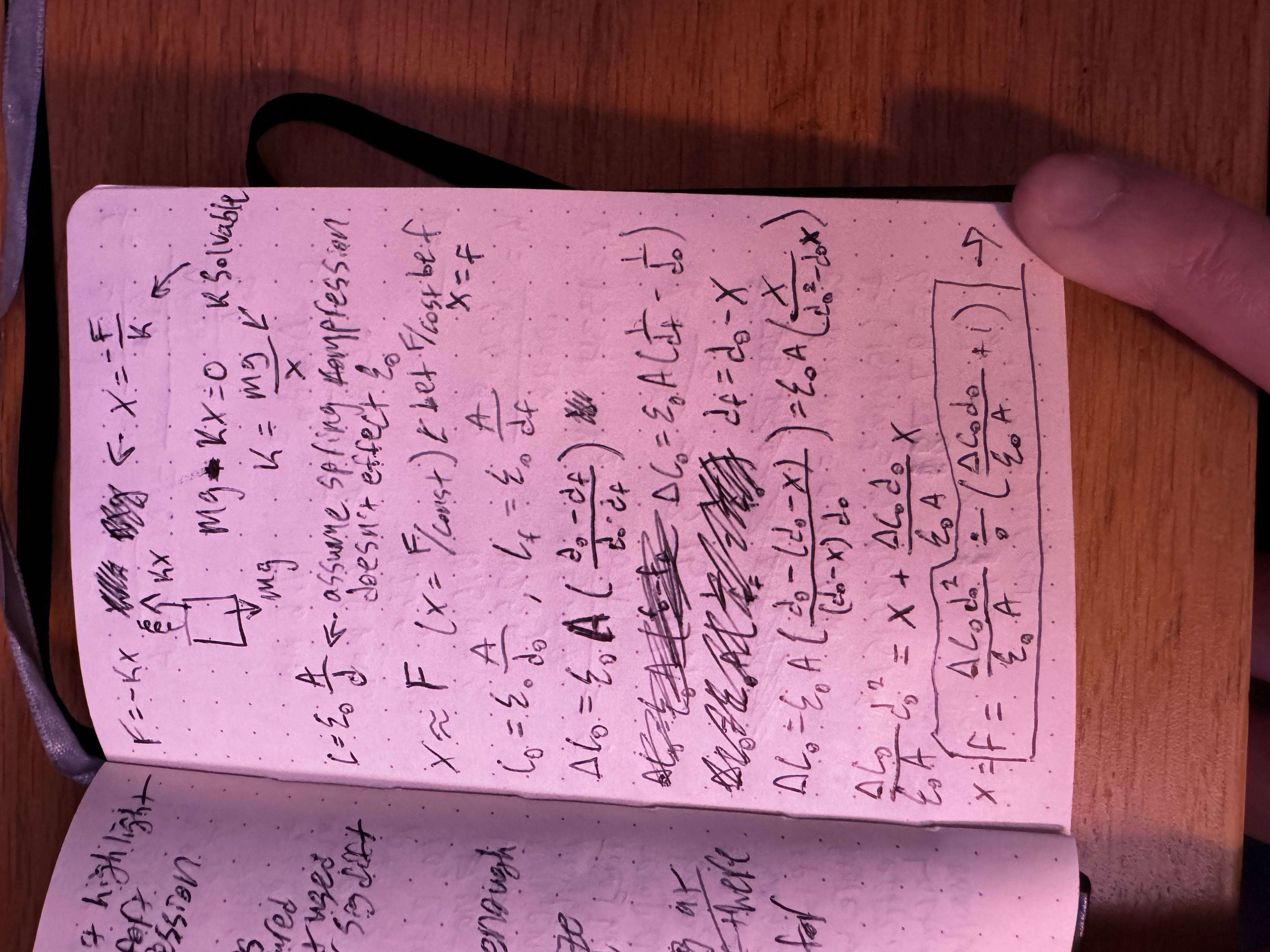 Man I thought I was gonna do something really cool here. In class, we talked about compression sensors using capacitance, so I thought that it would be cool to make a more formal force sensor using capacitance. Most normal force sensors use an integrated spring to pull some fancy physic kinematics or something like that to calculate the force applied using the spring constant and displacement. I really thought I was gonna cook with this and decided that maybe I could do the same thing! I knew that capacitance also had to do with displacement, just like the spring, so I figured there might be some shenanigans that I could pull to get force in terms of capacitance. Here are all of my chicken scratch notes where I solve for this.