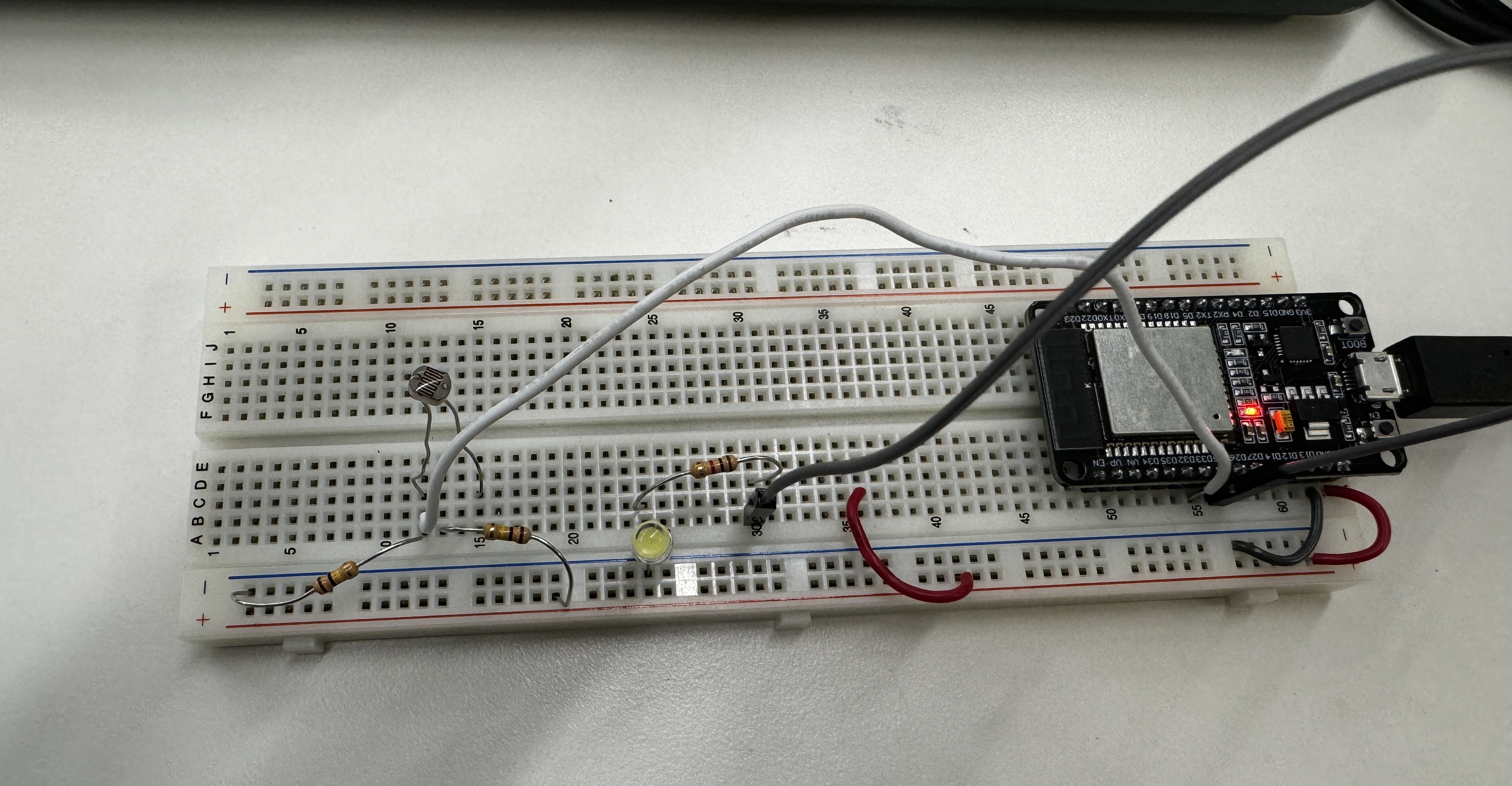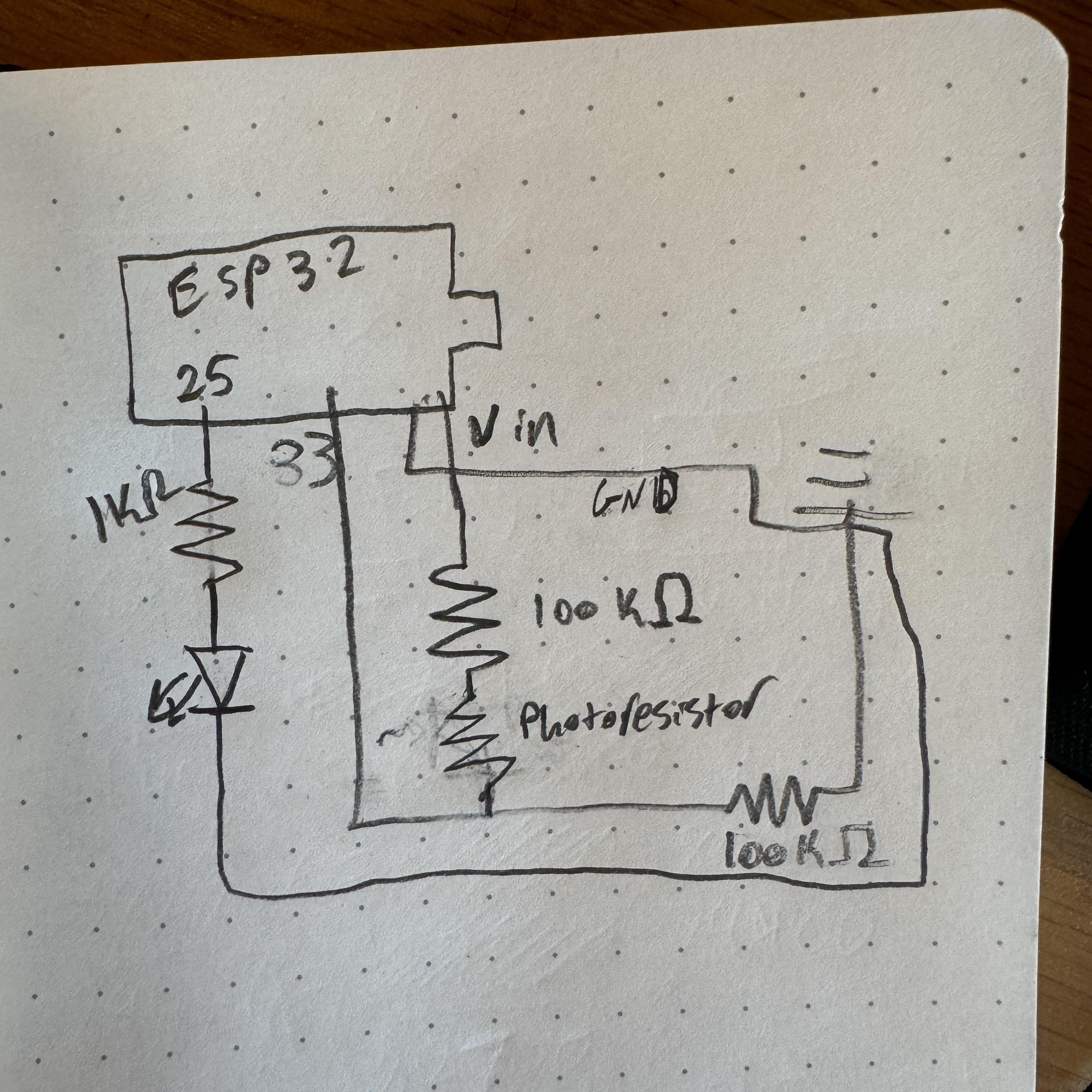 This time, I set up a disappointingly simple photoresistor circuit following the instructions on the website to build the voltage divider circuit. I added my rolling average code to the photoresistor circuit code from the website. Once I uploaded this, I was getting a constant 4095 which must represent the maximum possible value that the pin could interpret because it wouldn't go higher. I threw a 100 kOhm resistor in before the LED and that resulted in me having actual, readable values. There is unfortunately not much to say about this overall, and this is not the project that I am most proud of. I tested it using my phone's flashlight, and I added an LED to go off if the read value is greater than the value read with my phone flashlight at the lowest setting.