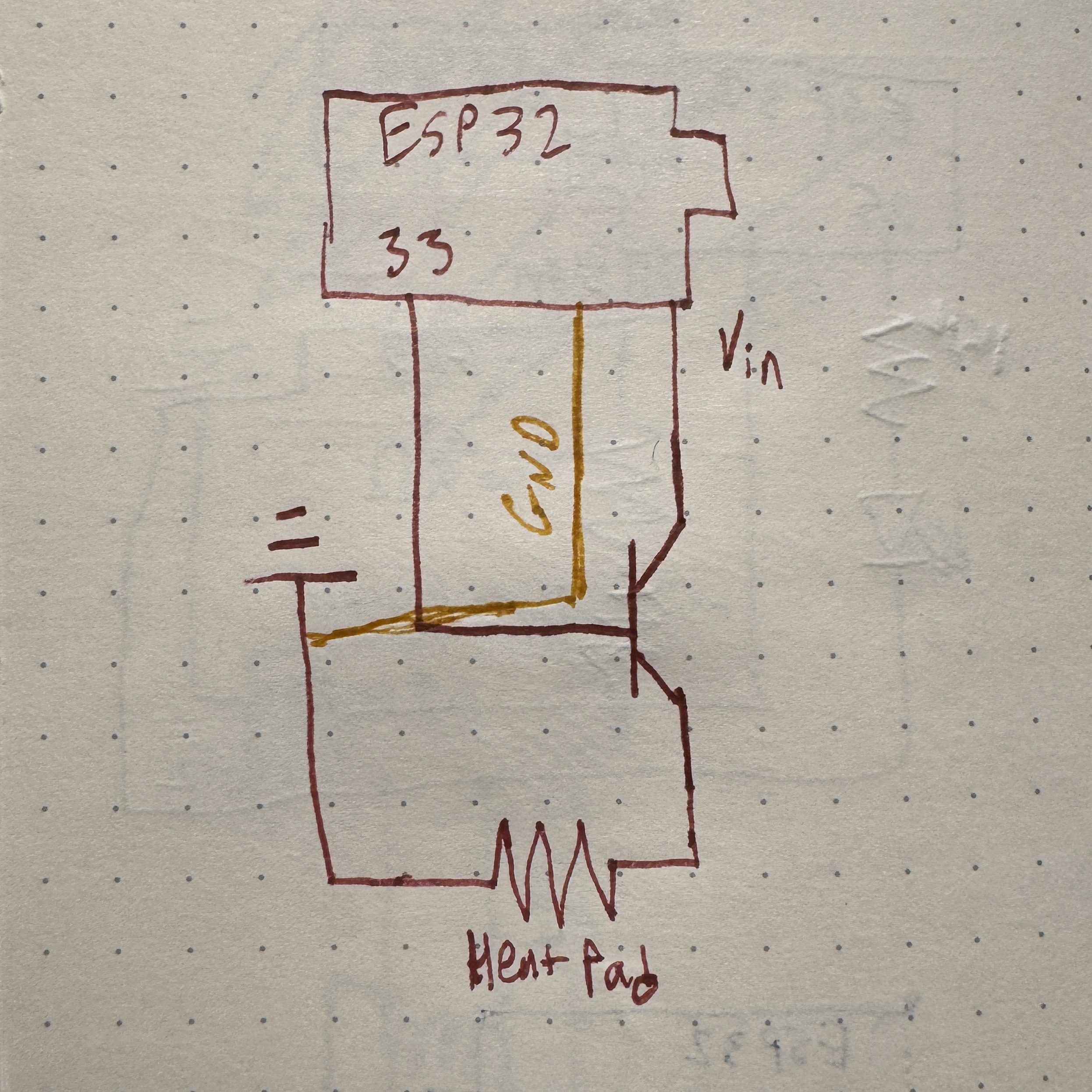 Once I inputted this equation as the transformation from resistance to temperature, it started to produce some reasonable values for things! I'm sure it could be better, but that will be for future iterations. I then moved on to figuring out the heating pad. Naively, I just plugged in the heating pad to a pin on the ESP32 that I set as an output pin and hoped that I could set the output to high and have the heat pad heat up. I wasn't totally wrong, but it definitely didn't work. After getting stuck for an hour (the amount of time Nathan said was acceptable to be stuck for), I asked Bobby to inspect it, and he immediately was like this is the wrong voltage. The frustrating part is that I knew that this was true from all of my research to build the bill of materials, but I just hadn't thought about the fact that that could be what was causing the issue. Anyways, glad that I asked, I began playing out with transistors to see if I could still use that 3.3V pin to control the heat pad while using 5V to actually power the heat pad. After realizing that transistors are directional, we got exactly that to work - the heating pad would heat up when I told it to! The circuit for this is below.