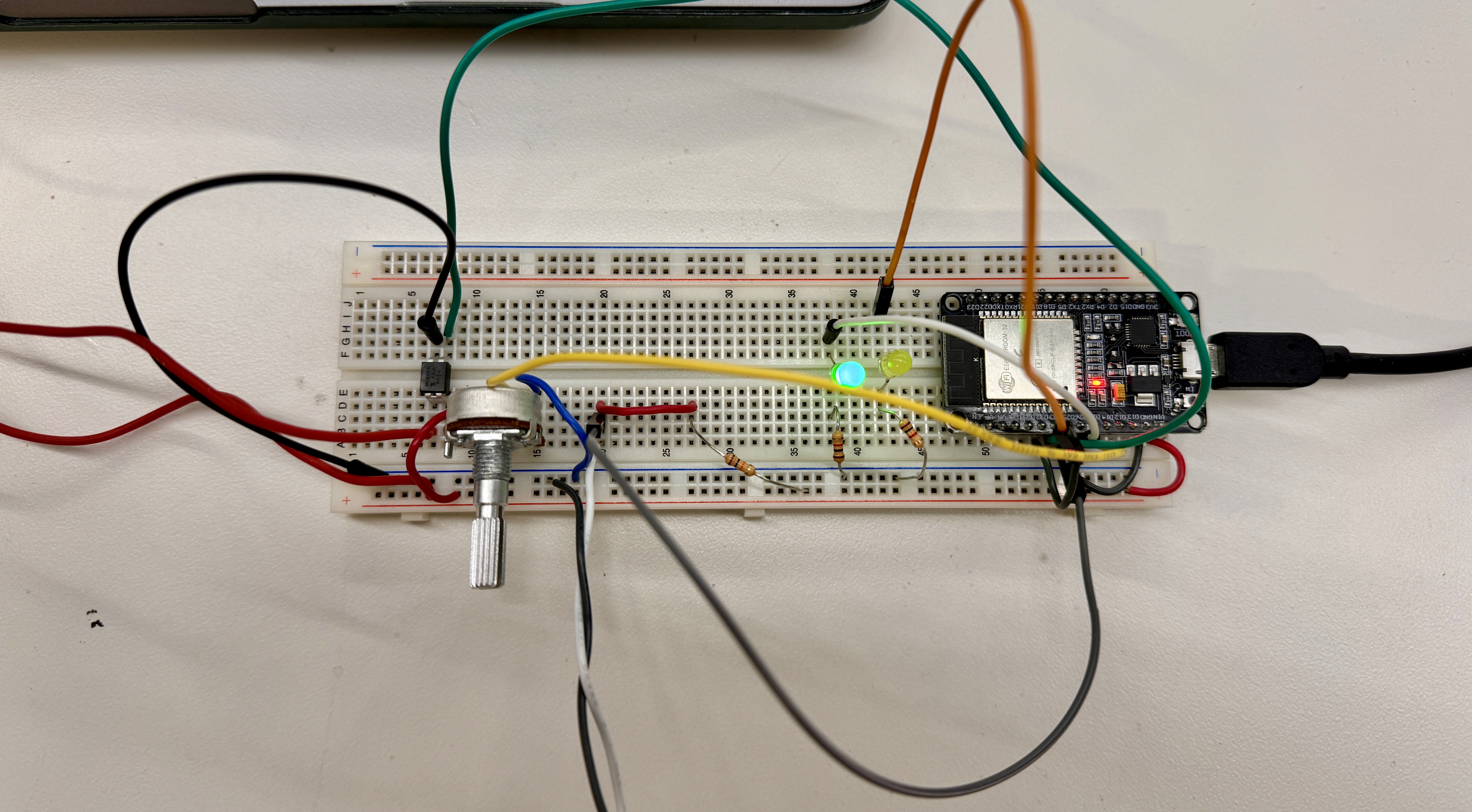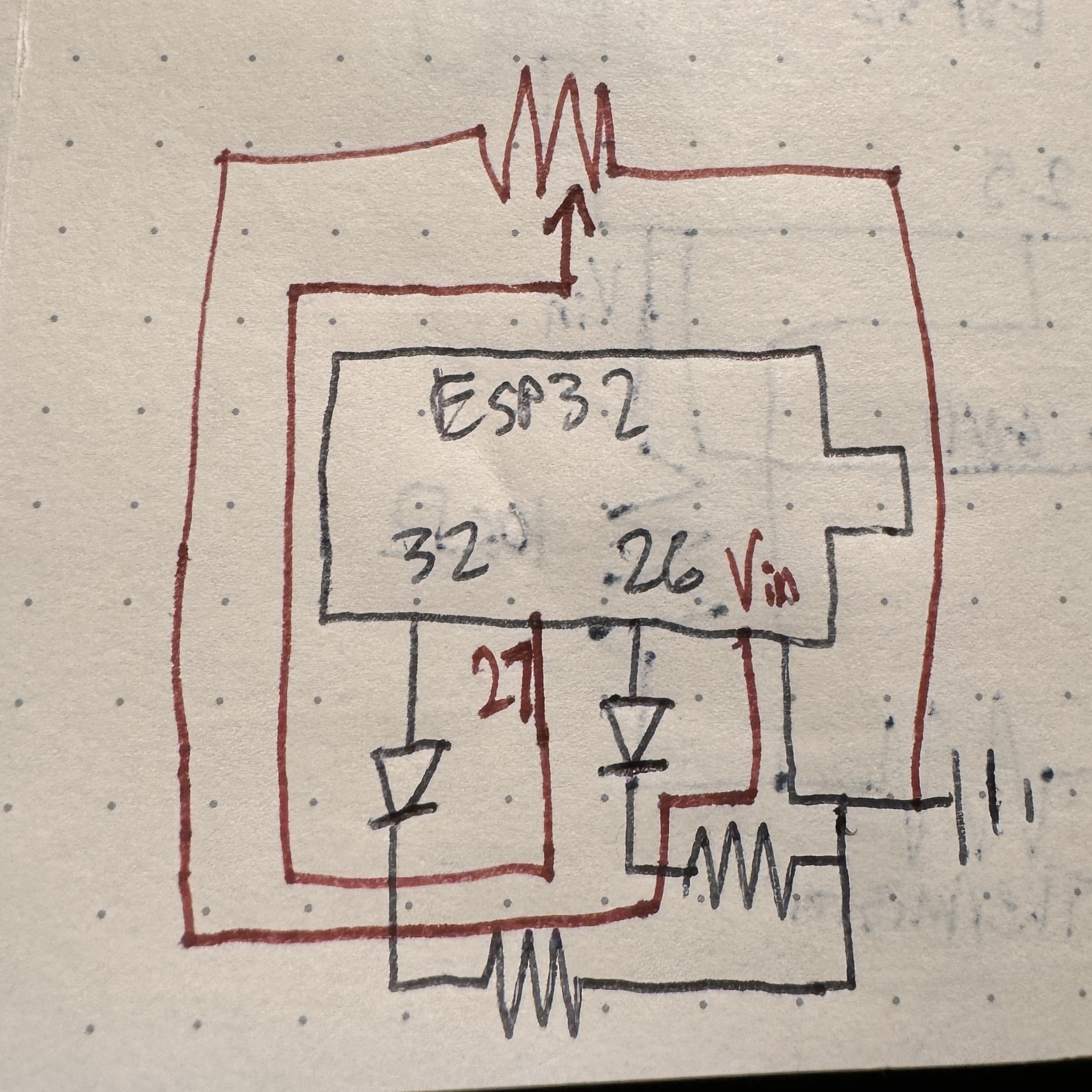 At this point, I had an extremely minimal project, but it was starting to come together. The next step was to get the thermistor that could now accurately read temperature to control the heat pad that could now produce heat. With a little bit of simple coding, I was able to get my heat pad to stay within a predetermined threshold. While the thermistor read a temperature lower than the threshold, it would heat up the pad until it reached the target temperature. Once it reached the target temperature, it would turn off the heat pad until it fell below the target temperature, and it continued to oscillate around the target temperature in this way, reaching a quasi-steady state of temperature. This worked! Unfortunately, I had written this without using the C++ class structure, so I rewrote the code to do exactly the same thing, but using the class structure. I had just created a truly minimum viable product that could heat up a heat pad to a specified temperature and hold it there indefinitely. To make this MVP slightly less M and slightly more V, I also added indicator LEDs to show when the temperature was within 1° of the target temperature (this was the buffer zone that I established that is deemed the correct temperature) and when the heat pad was on, even if it was within the buffer zone. This helps to understand how the heat pad itself is working and maintaining the target temperature. I also added a potentiometer, so that I could adjust the target temperature on the fly and not have to reupload the code each time, manually hardcoding it. I set the potentiometer to correspond to a range of temperatures that is dynamically updated with the different values of the pot ranging from 75-95°F, although with the current voltage limitations, getting above 90ish is tough. This will be fixed with a better power system. This all worked totally perfectly. No matter how I set the temperature using the pot, the heat pad would respond appropriately in order to attempt to get to and then oscillate around the target temperature. Here is the schematic of those things.