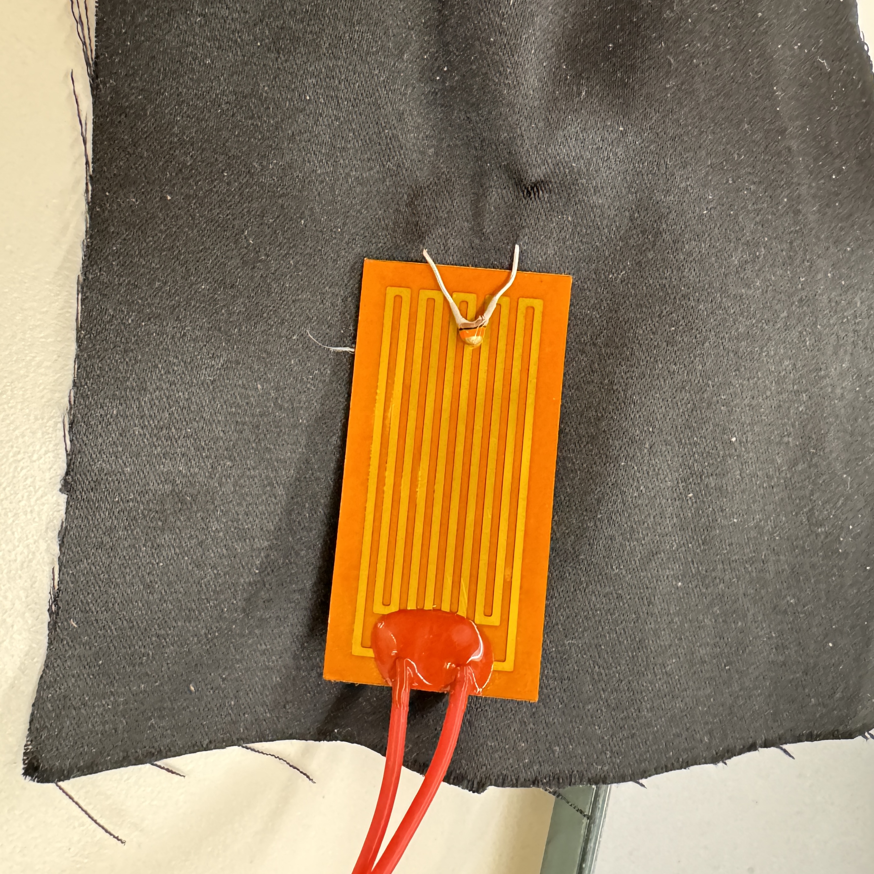 The only thing left was to make it look a little bit pretty. I attached the thermistor and heat pad to a piece of stretchy fabric that I found in the fabric box that closely resembles the kind of material that I eventually want the vest to be made out of. This held the thermistor against the heat pad, which may or may not be the case in the final version, but it is the best arrangement for testing and demonstrating when I am not wearing the heat pad in an enclosed space. With this all buttoned up, I had a better MVP than I thought that I would when I started! See it in action (to the best of my abilities) below.