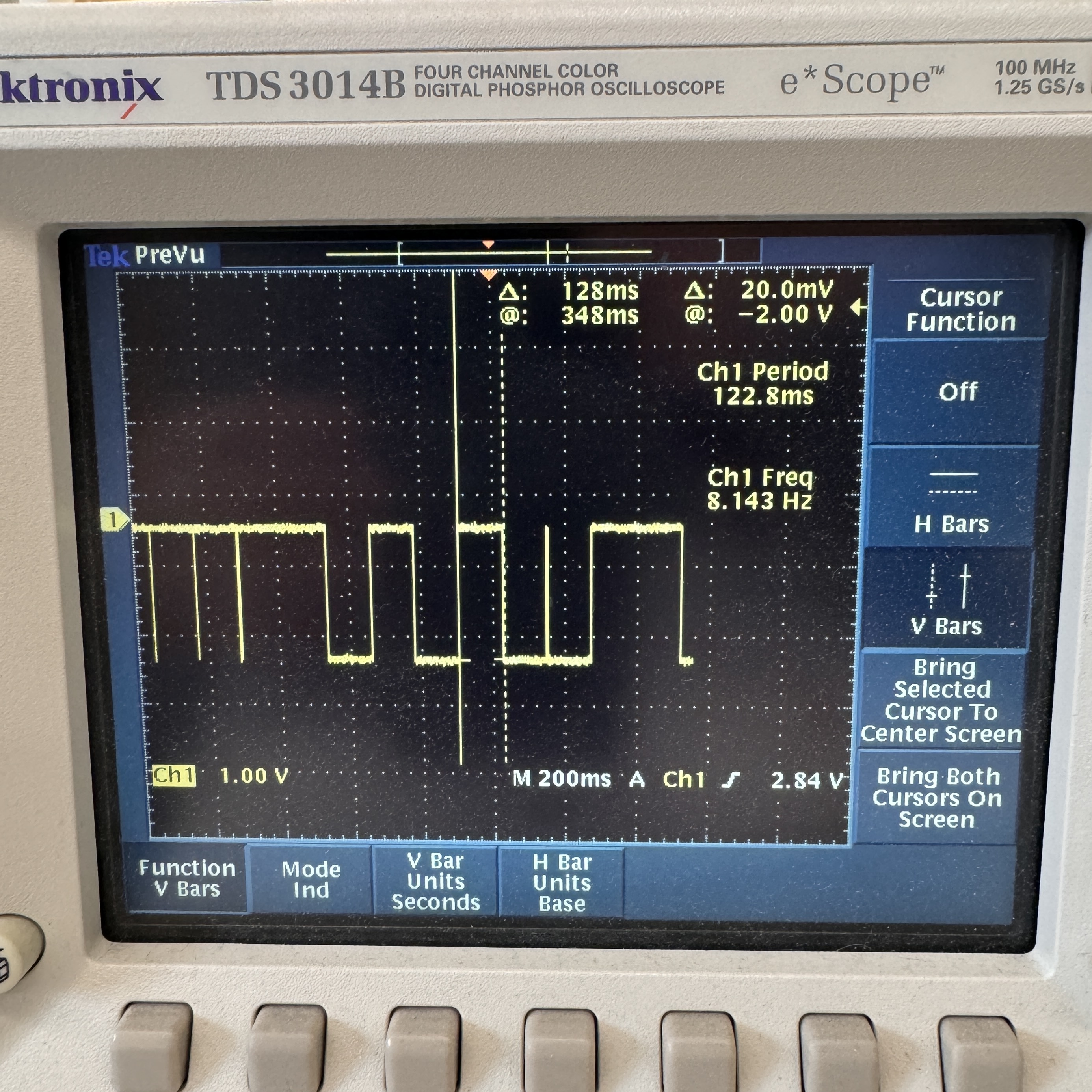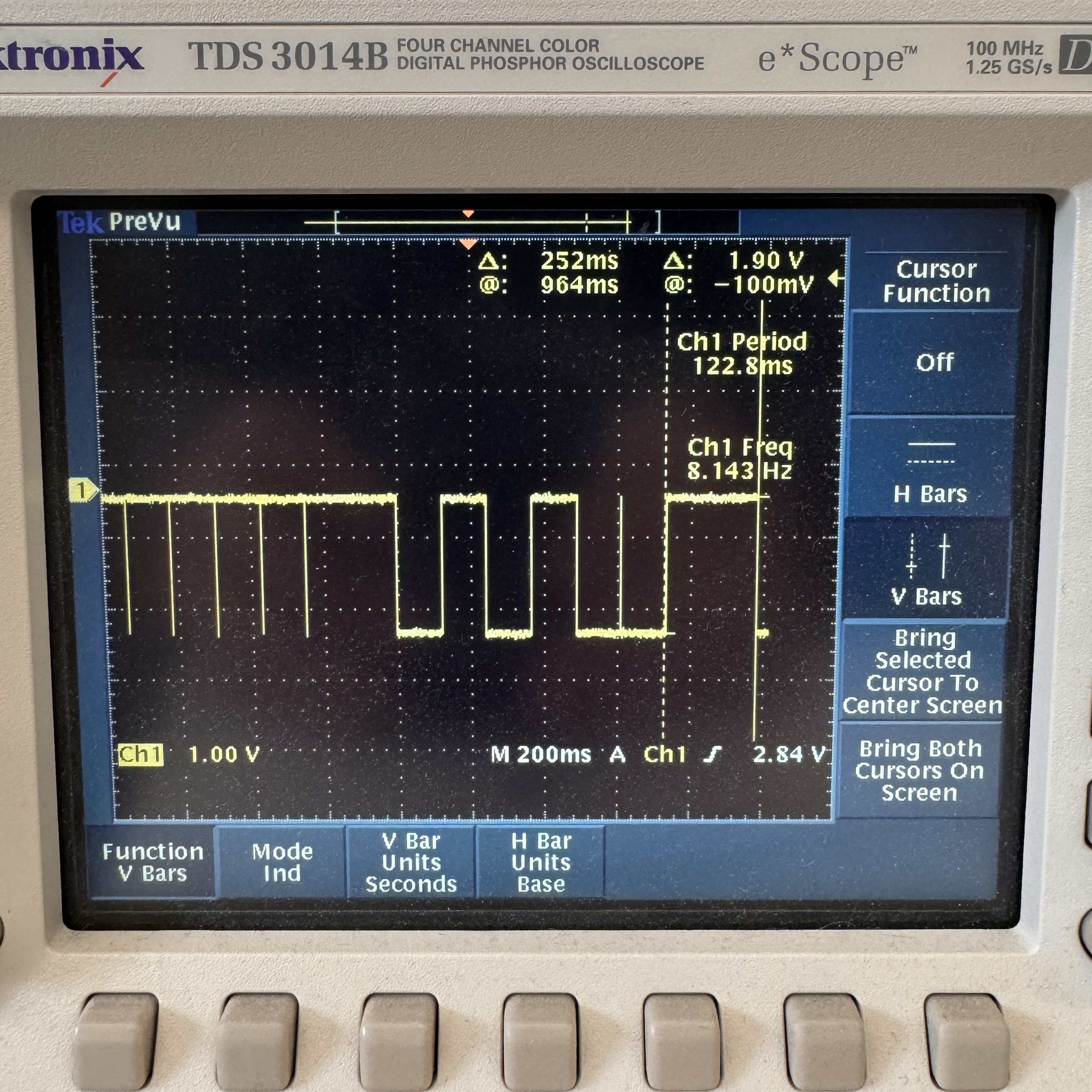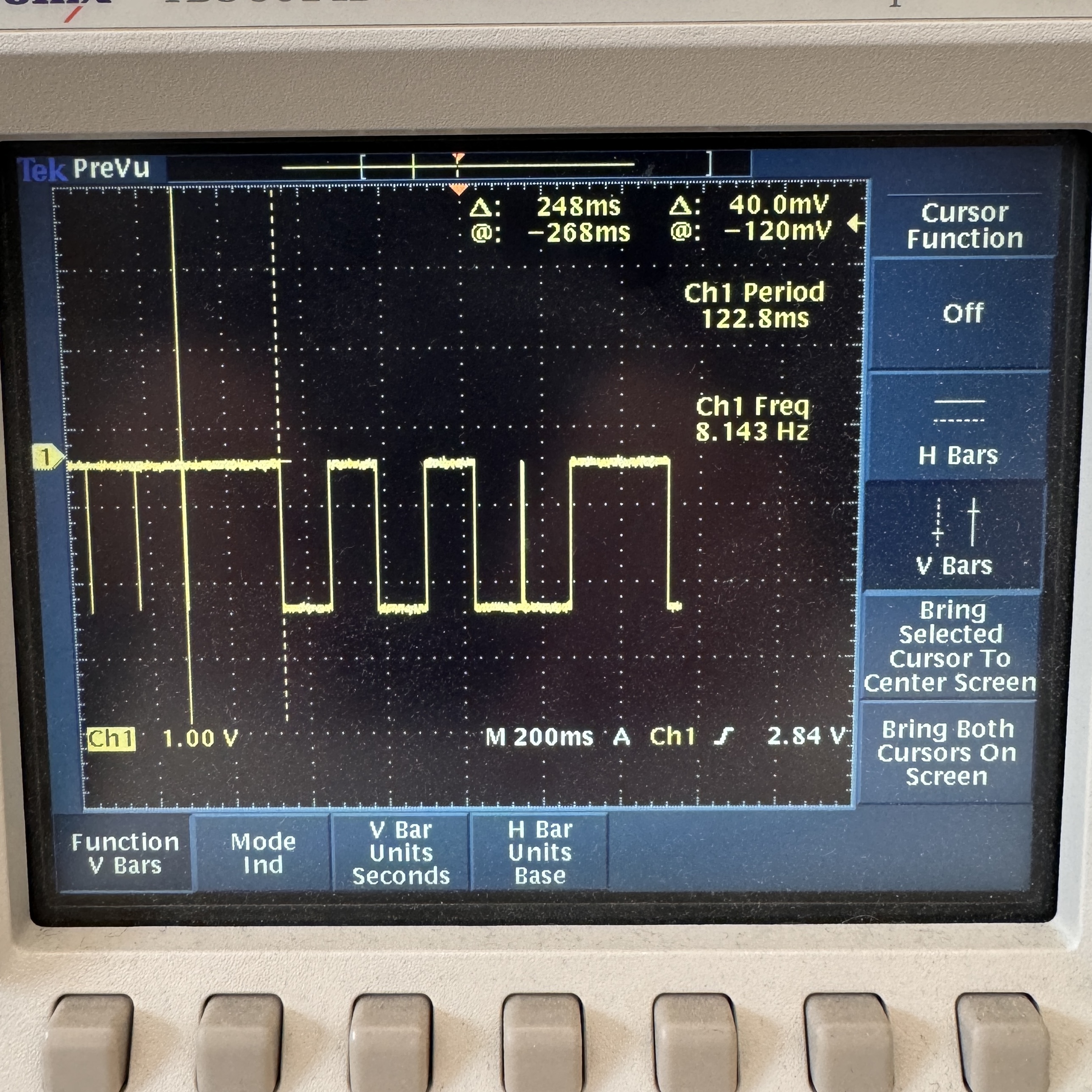 I also looked at the LED that lights up whenever the heat pad is turned on with the oscilloscope. Since it is not constantly on and is on for different periods of time each time, the idea of a time domain is not super applicable to this. However, I was able to look at the square waves indicating when the heat pad is on, and it showed me that the pad is turned on for ~125-250ms at a time. It is not on a fixed clock. This shows exactly how the heat pad is being pulsed on and off to maintain a constant temperature.