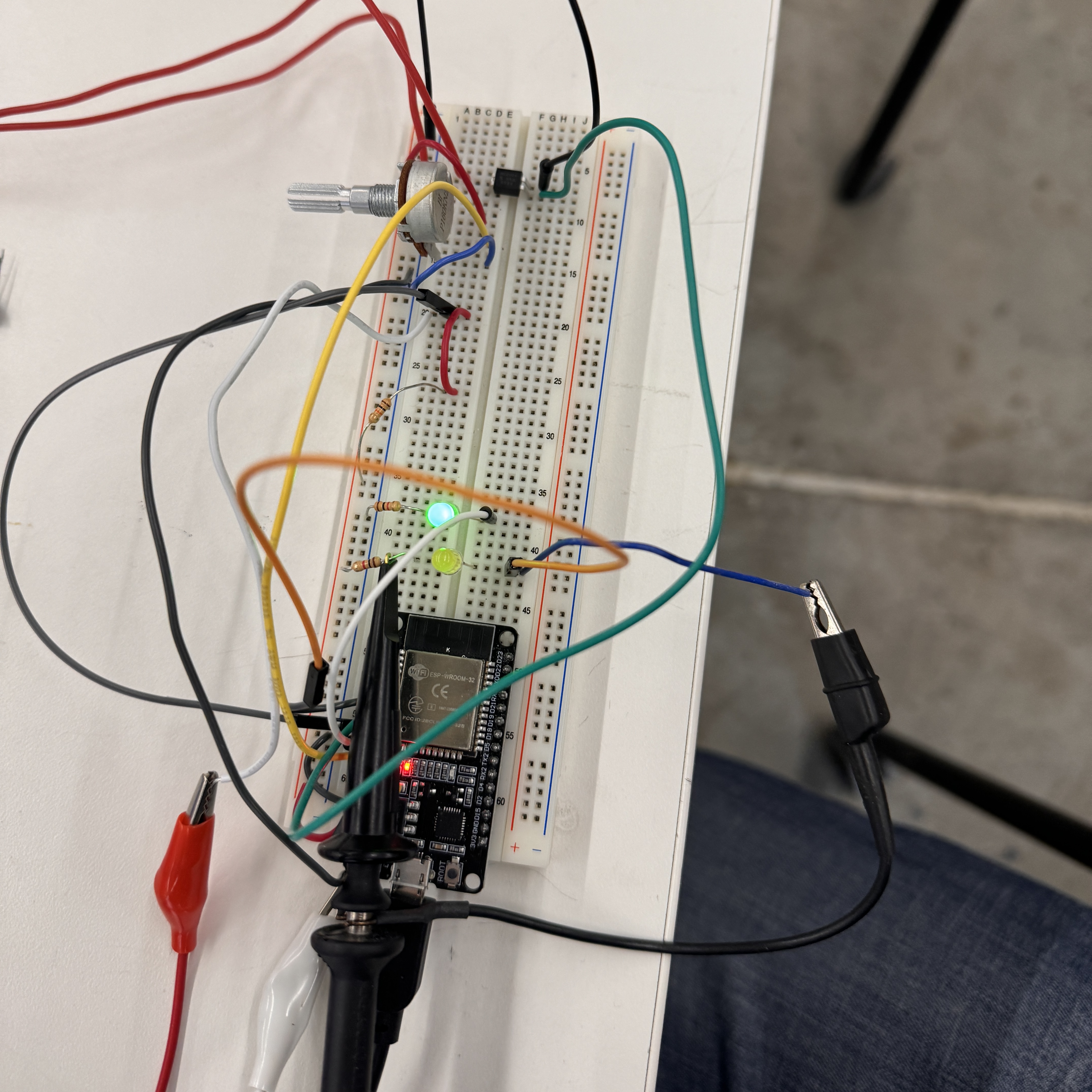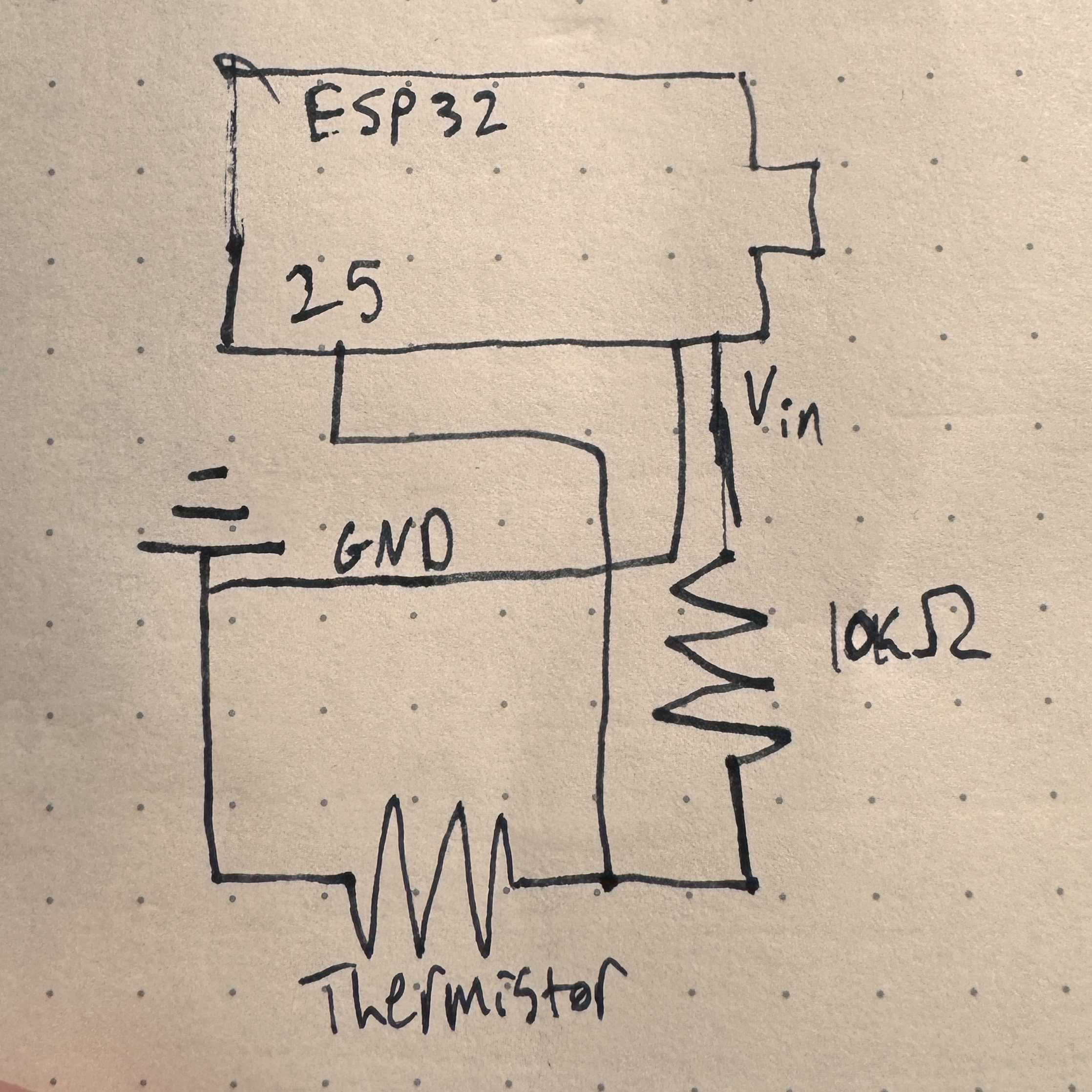 Oh baby, it's a big one - it's MVP week. We were told to tackle the most challenging part of the final project - a somewhat daunting task to receive during thesis crunch time, but nonetheless more specific than some other weeks. With some help from Bobby and a little common sense, I began to do exactly that. I knew that I wanted my MVP to have something to do with the heating element and control of that because that seems like the most technically challenging part of my project other than dealing with power, which will only be a problem once I have the final materials for the project. Sidenote, I honestly think that the sewing part of this project might take me the longest/be the most challenging for me because I have literally no experience with that, but that didn't feel like the vibe of the MVP, so I stuck with the heating element. We also don't have the big heating pads in stock that I want to use, but we do have little itty bitty ones, so I used that for a proof-of-concept that my heating circuit and code will work. The first step that I took to accomplish my MVP was to get a thermistor up and running - a crucial step to avoid setting myself on fire. This involved calibrating the thermistor, and, as I sat in front of the toaster oven while Kassia was trying to teach her lab around me, I found myself wondering why I didn't just do this for the sensor week. Regardless, I didn't, so I needed to do it now. I built a basic thermistor circuit with a voltage divider following the one we have on the PS70 website. Once I pinched it a few times to confirm it was working, I got to calibrating it. I wanted it to be really honed in on the 90-150ish °F range because I feel like that will be the most important, but that proved to be pretty difficult. I think that a massive improvement to this project in the next iteration will be having higher quality thermistors that are more accurate and precise. Here is the circuit diagram for just the thermistor circuit below - there are a bunch of different circuits all on the overall breadboard, so I think it will be much easier to understand for both of us if I break it up.