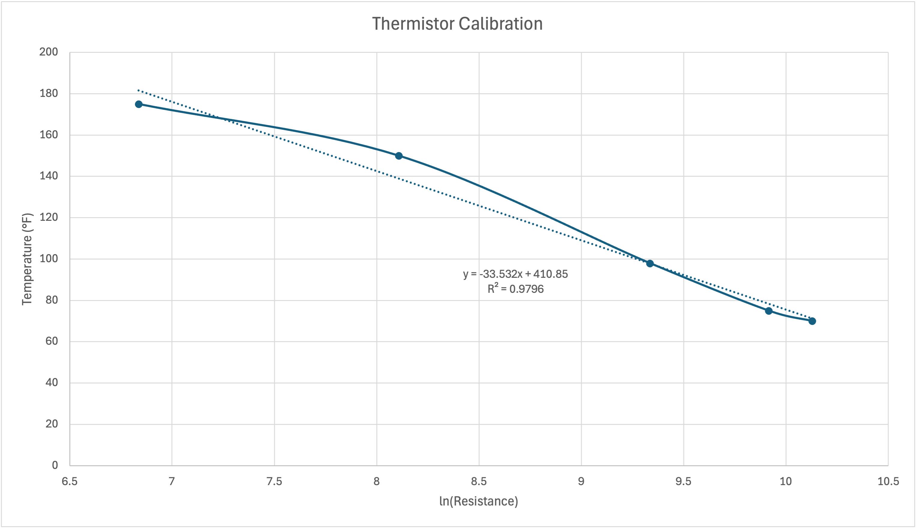 I started the calibration process by attaching the thermistor to some alligator clips and sticking it in the toaster oven at its lowest possible setting, 150°F. I wrote my thermistor code so that it was reporting a rolling average of the temperature to minimize noise in the same way that I did for the last assignment. Even with this rolling average, I could not get the thermistor to report a consistent reading while in the toaster oven, even after the oven reached a theoretically constant temperature. The readings would follow a roughly sinusoidal pattern, rising and falling but never settling on a consistent value. Because I wanted to establish an upper limit for the temperature (I don't want the temperature to exceed a threshold), I chose a value that was slightly higher in the range that the values were oscillating between and wrote that as the resistance value at 150°F. I repeated this process again at 175°F and recorded another resistance value. I would have kept going here, but I was realizing that this thermistor likely would not be my final one as I will eventually want a more precise and accurate one, so I decided to continue at lower temperatures to get the other part of the domain. I measured "room temperature" in a cold room and warm room, estimating their real temperatures, but interestingly, the thermistor reached more of an equilibrium in these scenarios than in the oven, and I measured it in my armpit, which I decided was approximately 98°F. With these values, I plotted temperature vs the natural log of the resistance value (to linearize the relationship) and found a best fit line, which I established as the equation to transform resistance values into an accurate temperature for this thermistor. This can be seen below.