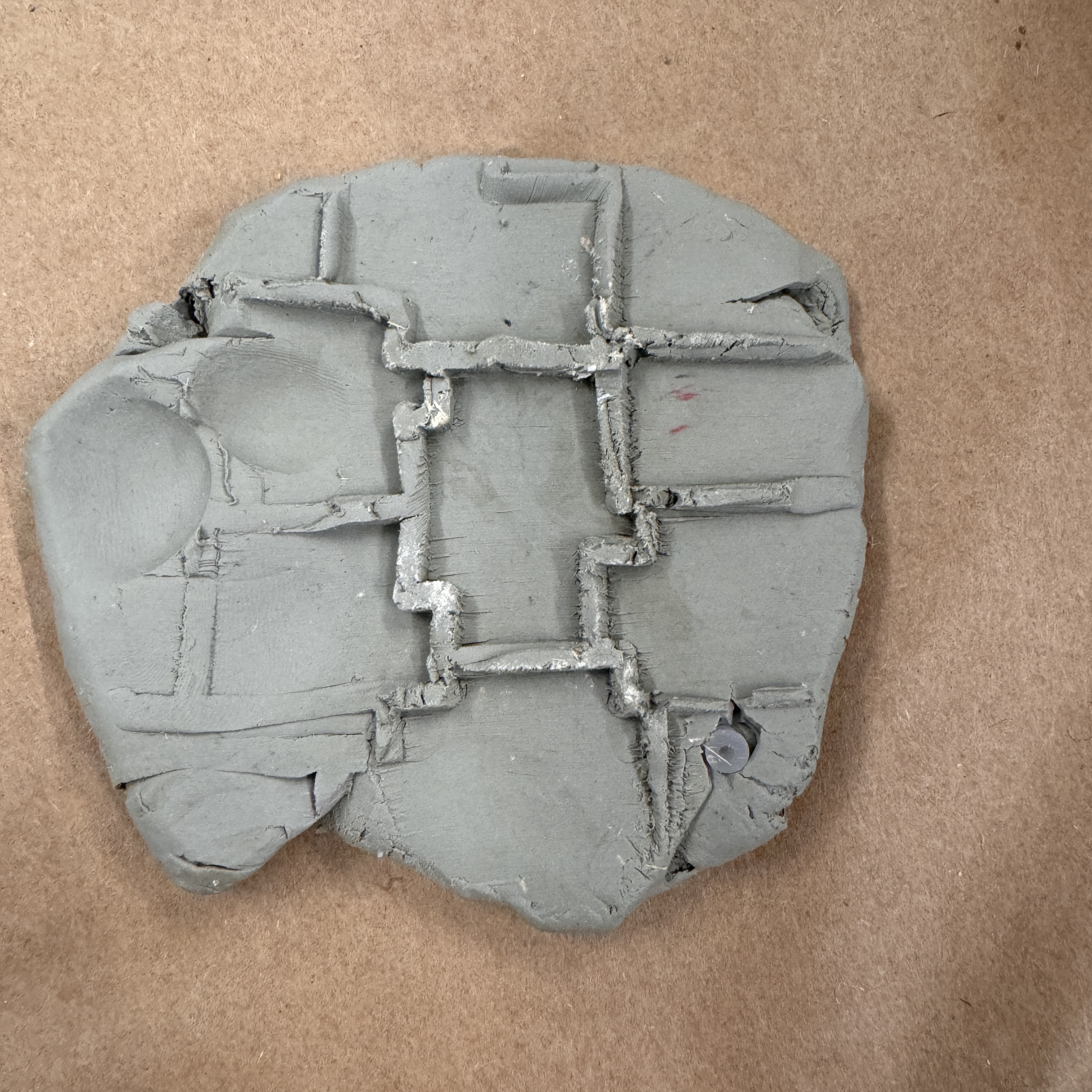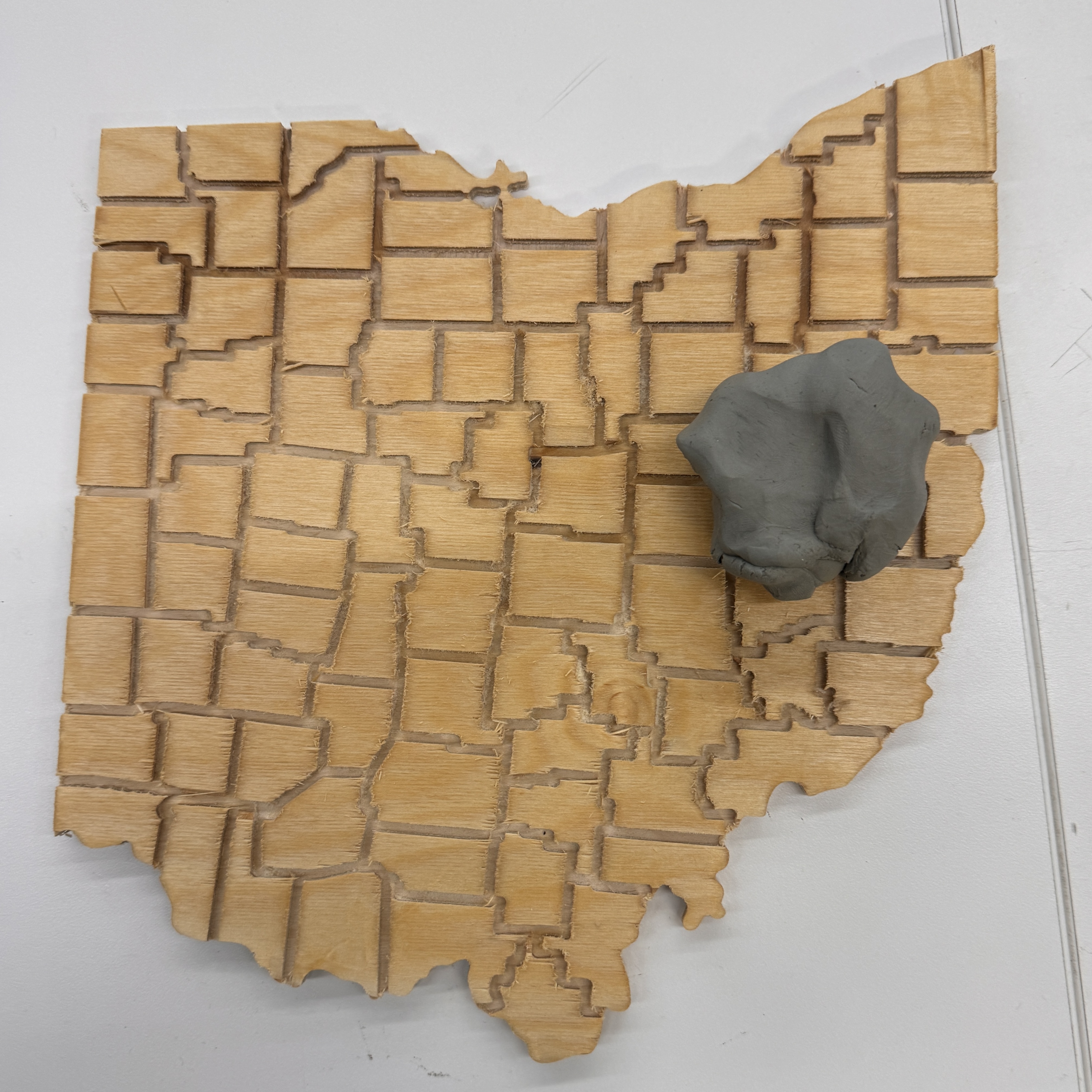 After a brief sanding on the belt sander and a quick finish with a mystery finish from the closet, and I was happy enough with how this first pass turned out. I then had to tackle the unresolved lack of casting ideas issue. I was again paralyzed by indecision for another hour, spending time seeing if I could quickly 3D print something or convert STLs I found online into DXF files for the CNC, bouncing around from random pieces I found in the lab to a 3D printed coaster. I eventually got to a point where my indecision cost me too much time, a very valuable resource right now, so I decided to make something with what I had available. My Ohio cutout was much too big for any vacuum forming or plaster casting or something like that, so I instead decided to shove a bit of the modeling clay around the county that I am from in Ohio to create a mold of it.