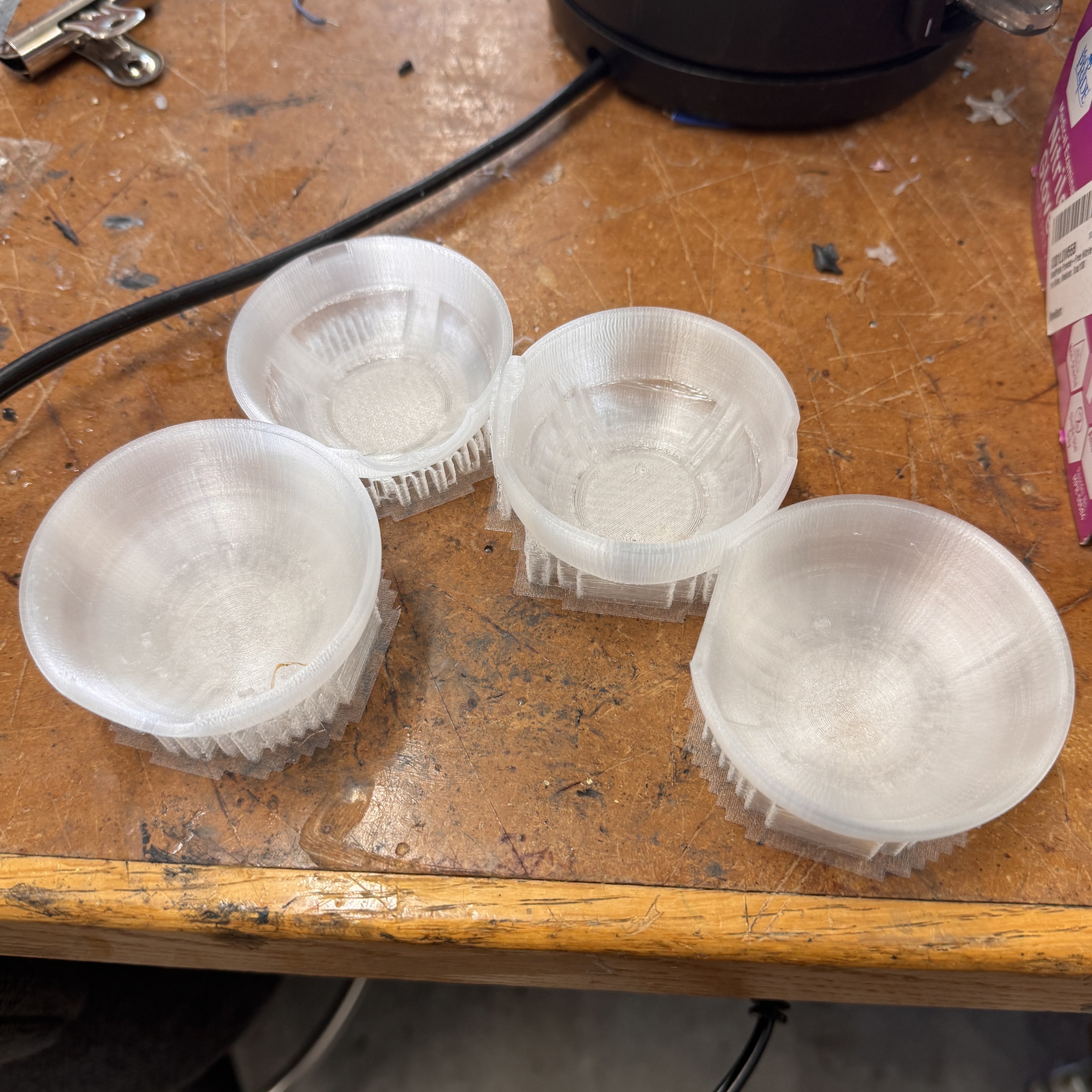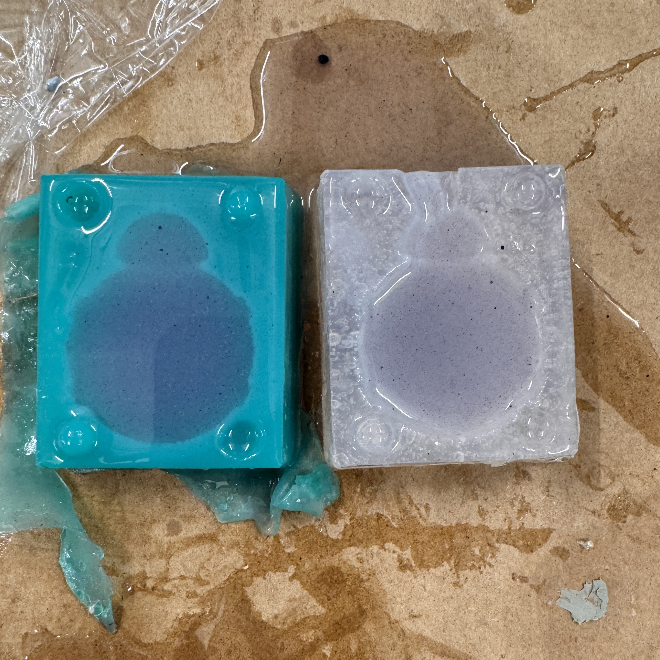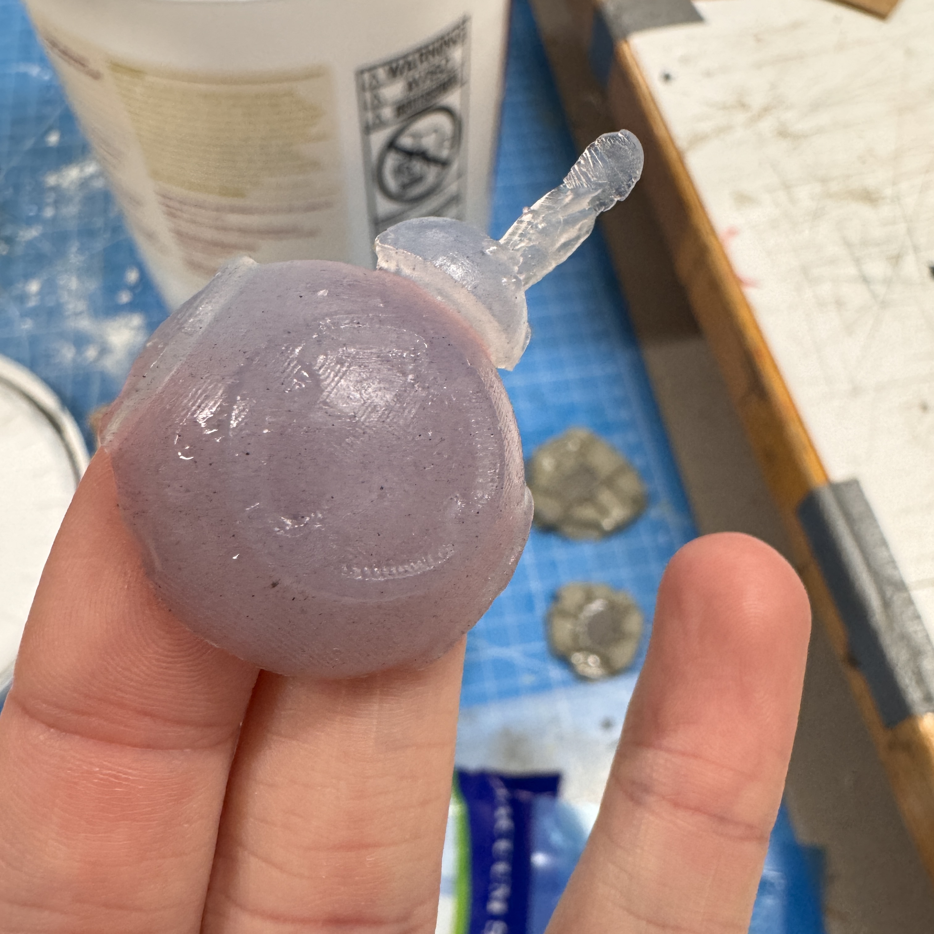 I ended up making two of these molds and filling it with a purple silicon that had some sparkles in it that I thought was pretty cool looking. With the leftover silicon, I tried to use one of the two-part molds that was already in the molding box of BB8, but I quickly understood why the teaching staff tried to steer us away from using two-part molds and ended up just filling each half of the mold separately. If I am feeling so inclined, I can glue them together after they've cured.