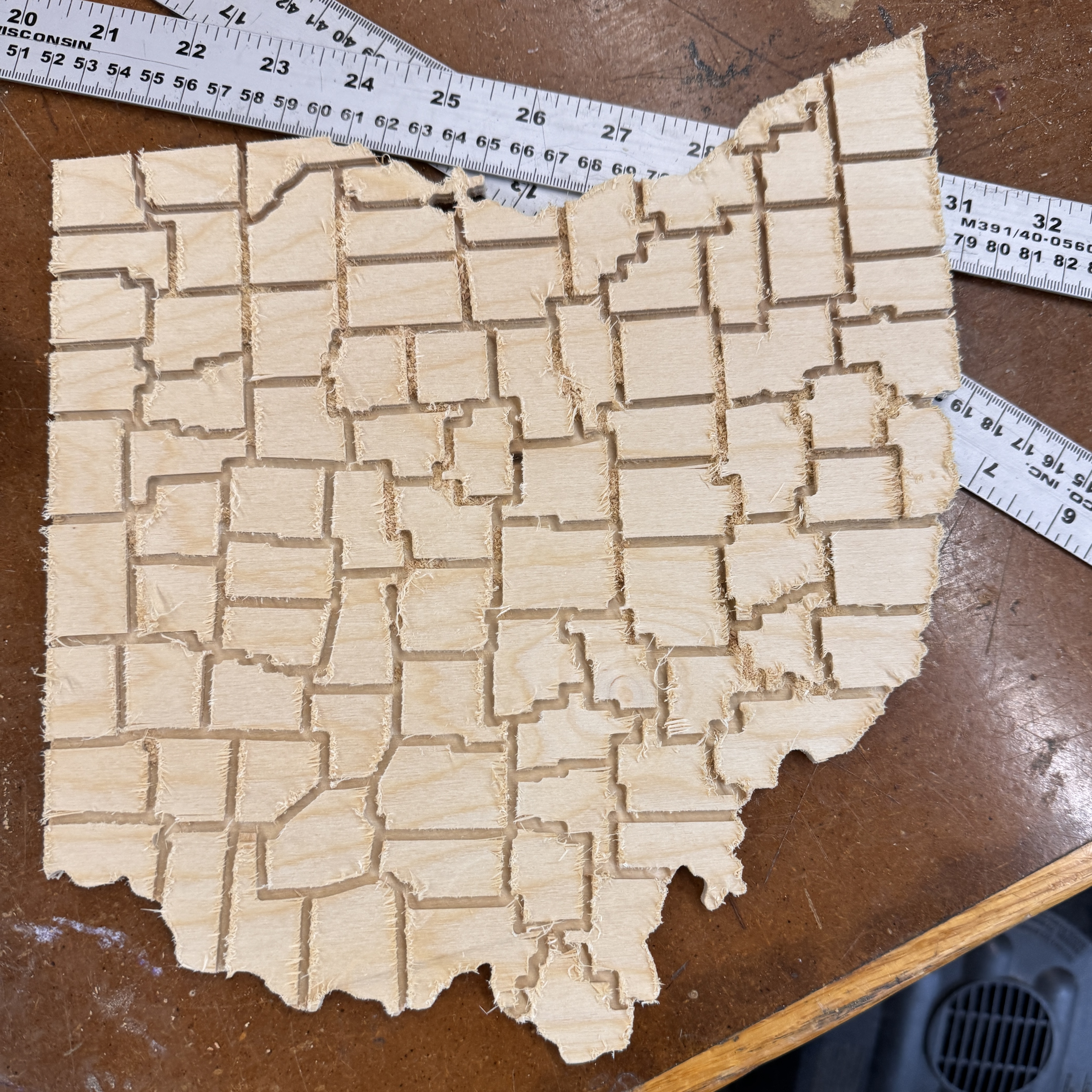 this map online. It didn't have all of the county names, but I was able to add those in Fusion. Unfortunately, upon loading up the DXF file into Aspire, Bobby and I realized that the county names would likely be too small to cut out, so I went back and deleted all of the names that I had just put in. I think what I will eventually do is get a larger, nice piece of wood and maybe a smaller end mill, or I will just mill out the boundaries and use the laser cutter to engrave the county names. I will definitely do more testing first to ensure that I can do this with minimal splintering and with some more precision. Regardless, I did cut out the county boundaries and the outline of the state itself for this week's project.