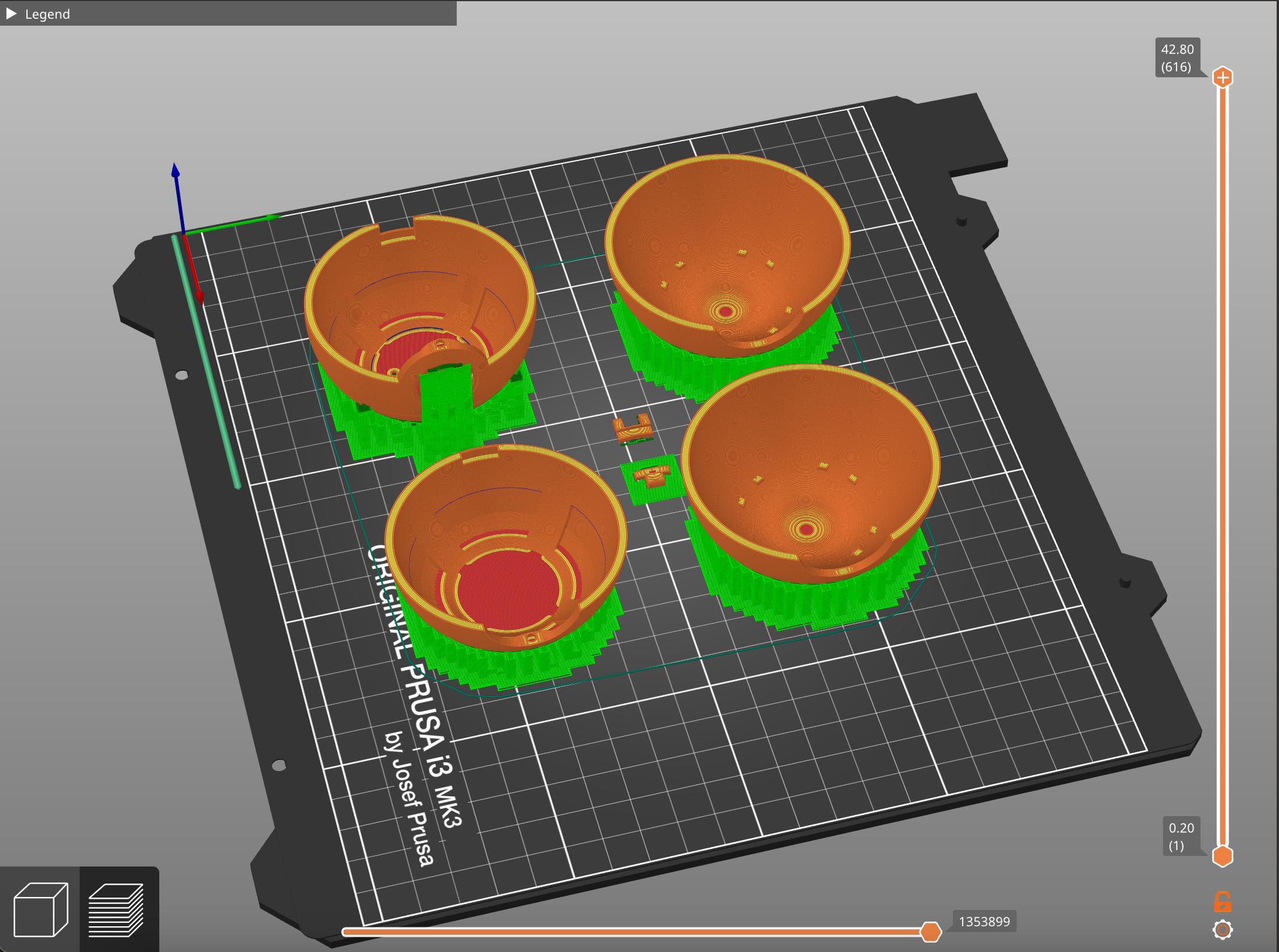 Overall, I think I would describe my work this week as disappointing. This is one of the weeks that I was most excited for coming into the class because I had never used a CNC machine before, and they seemed so awesome. Combine that with the plethora of materials that the shop has in stock, I really wanted to make something cool and not basic for this week. With that in mind, I set out on making a real-life pokeball. I wanted to do this for the molding and casting component of this week because layer lines on a sphere look unappealing to me, so sanding it down a bit before casting it in a more easily rounded material like acrylic or epoxy sounded very appealing to me. I wanted to add a servo that opens and closes the ball upon the click of a large, silver button on the front, and a second servo to act as a shaking mechanism to mimic the in-game mechanics. If I had time, I wanted to add other features like sound, but the first goal that I wanted to achieve for this week was to just get a pokeball molded and casted and install the button that would light up when clicked. This seems very reasonable in a vacuum, but this is the last week of my thesis, and I am in a bit more of a crunch time than I realized. After being paralyzed with indecision for over an hour, I talked it through with Bobby and realized that this might be too much of a stretch goal to accomplish this week. I felt upset that I spent so much time planning this project, only for it to fall through before it even really started. I still ended up printing out the pokeball on the 3D printer in hopes that I will have time after my thesis is done to realize my dreams. Here is a picture of the parts in the prusa slicer before being put onto the printer: