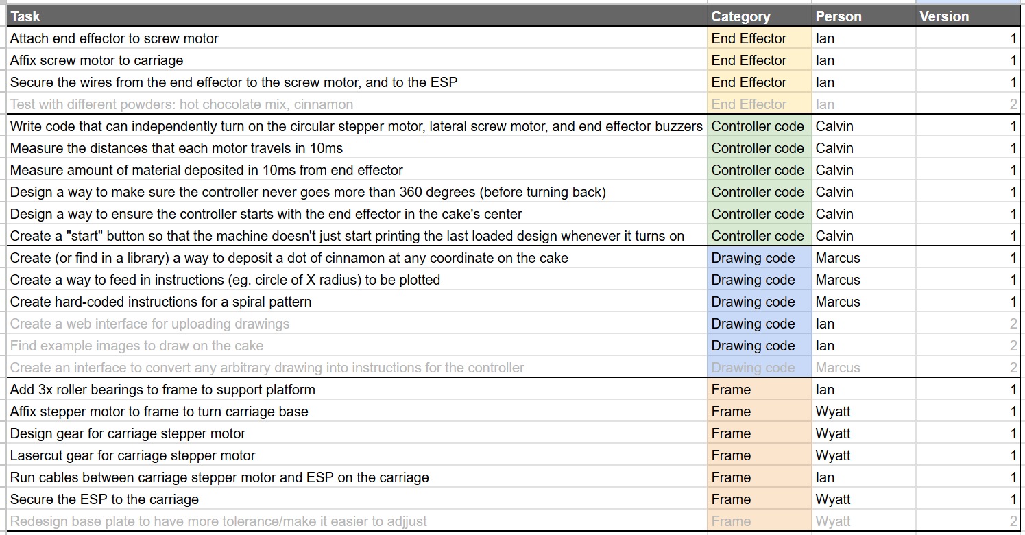 After that, we decided that the most effective way to attack this project would be to divide and conquer so that we could maximize the potential of the diverse skill sets on the team. Wyatt and Ian are better at hardware, designing things, and then bringing them to fruition, and Ian already had some ideas about end effector design, while Wyatt had designed the gantry prototype, so Ian took the end effector and Wyatt took the gantry. On the other hand, Marcus and Calvin were coding wizards, so they set off on the arduous task of converting lines to coordinates and then coordinates to movements. We will be breaking each of these tasks down individually below and the timeline that it took for them to each get to a point where we could put the whole machine together and start testing. Here are what each of us were assigned to work on, though, as all good plans do, things didn't necessarily go exactly to plan.