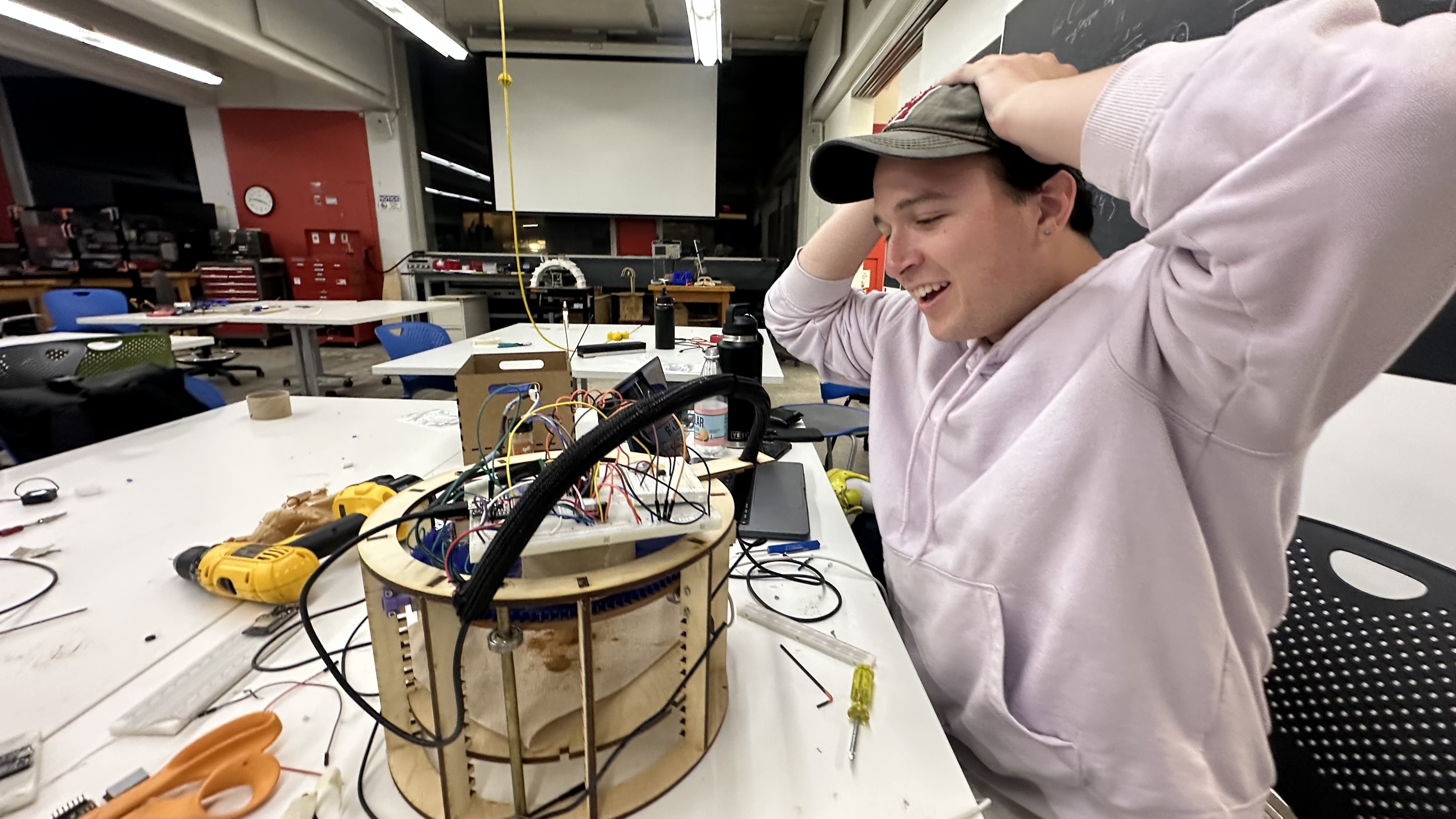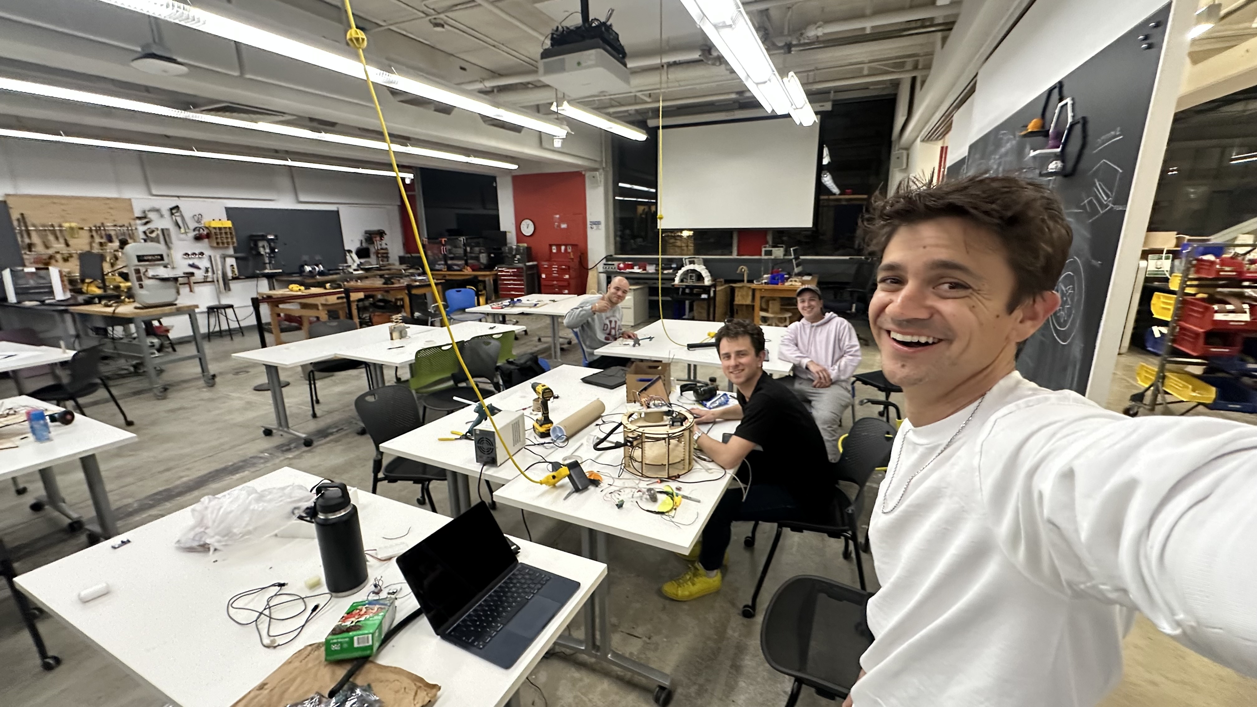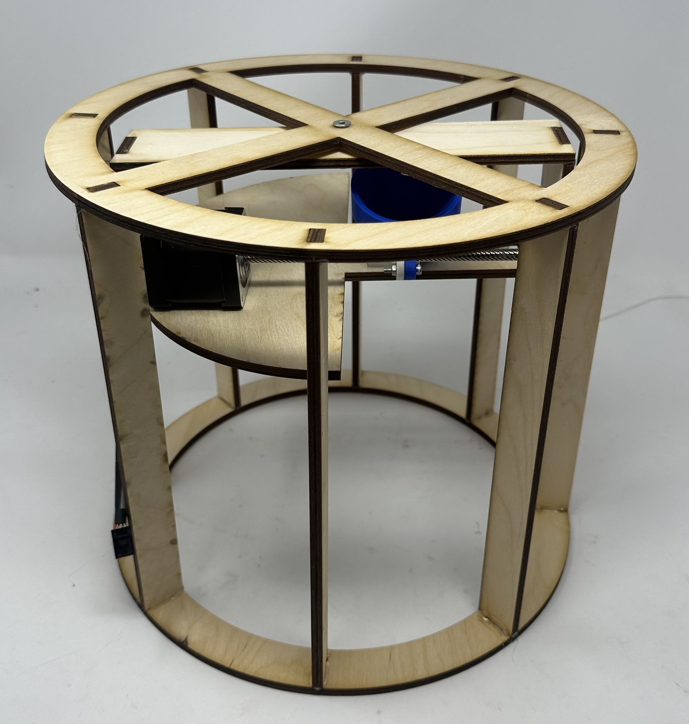 For a stupid, ungodly amount of time on the night before the assignment was due, we locked ourselves in the PS70 lab until this project was done. If I tried to document everything that went wrong on this all-night bender, it would be a multi-page essay, so instead I will cut right to the chase on the highlights. We replaced the top platform with an acrylic version and the rotating gear with an acrylic gear to make the whole thing flatter and rotate more smoothly. We designed a little enclosure that hot glues to the top platform that holds the stepper motor in place, while still allowing us to pick up and place the motor down for debugging. The vibrating motor wasn't cooperating for a myriad of reasons and everything that we did seemed to make it worse, which we narrowed down to it being a power issue. To remedy this, we hooked up an entirely separate power circuit using a tiny ~3.7V LiPo battery that definitely wasn't harvested from a vape and connected it to our main circuit via a common ground and a transistor. The transistor gate is connected to a data pin on the arduino, so when the arduino sends a high digitalwrite, it connects the circuit of the 3.7V LiPo to the vibrating motor and allows us to control when it vibrates. This was originally giving us weird voltage spikes, but it was due to an issue with common ground. Now, we had an insane rat's nest of wires, and the most technical and effective solution we could devise was to use copious quantities of masking tape, hot glue, and cardboard. All it takes to run the motor in a circle is one hand holding up the cables instead of four hands praying to every deity that something doesn't come unplugged and start a fire! Through what can only be described as delirium, we squashed a seemingly never-ending stream of little issues that kept cropping up, and ever so slowly crept towards a more finalized version. Then, at approximately 4:36 AM, a miracle struck. Our stupid little end effector slowly inched towards the limit switch, hit it and indicated its home position, inched forward, deposited the single most promising dot of cinnamon known to mankind, then began to make some of the most beautiful circles any of us have ever seen. After some tweaking of the motor speeds, center position, and when to turn on/off the vibrating motor, we had the single most overengineered circle drawer ever. And it was amazing. We needed to reprint the end effector with a higher infill and more robust design because it got destroyed one of the times the motors went haywire, and we needed to sift the cinnamon before our demo to ensure that there was no clumping, but other than that, we are ready to wow everyone with a delicious cake and some awesome cinnamon circles.