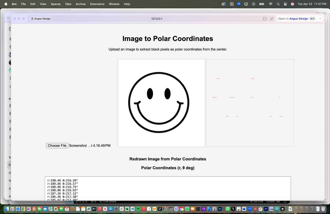 We originally tried to make it so that we could upload any line drawing to a website, automatically convert it to polar coordinates, and then we could make the motor track those polar coordinates and replicate the uploaded image. We got the first half of this mostly working, and could convert line drawings to polar coordinates, but soon after trying to implement this code, we realized that it was going to be way too hard to get the motors to follow these coordinates. We got each of the motors running individually, but the motors were not cooperating with us and refused to work well in tandem to follow the coordinates that we laid out, since that would involve code running simultaneously instead of in sequence. With that in mind, we scrapped this idea and just focused on getting circles.