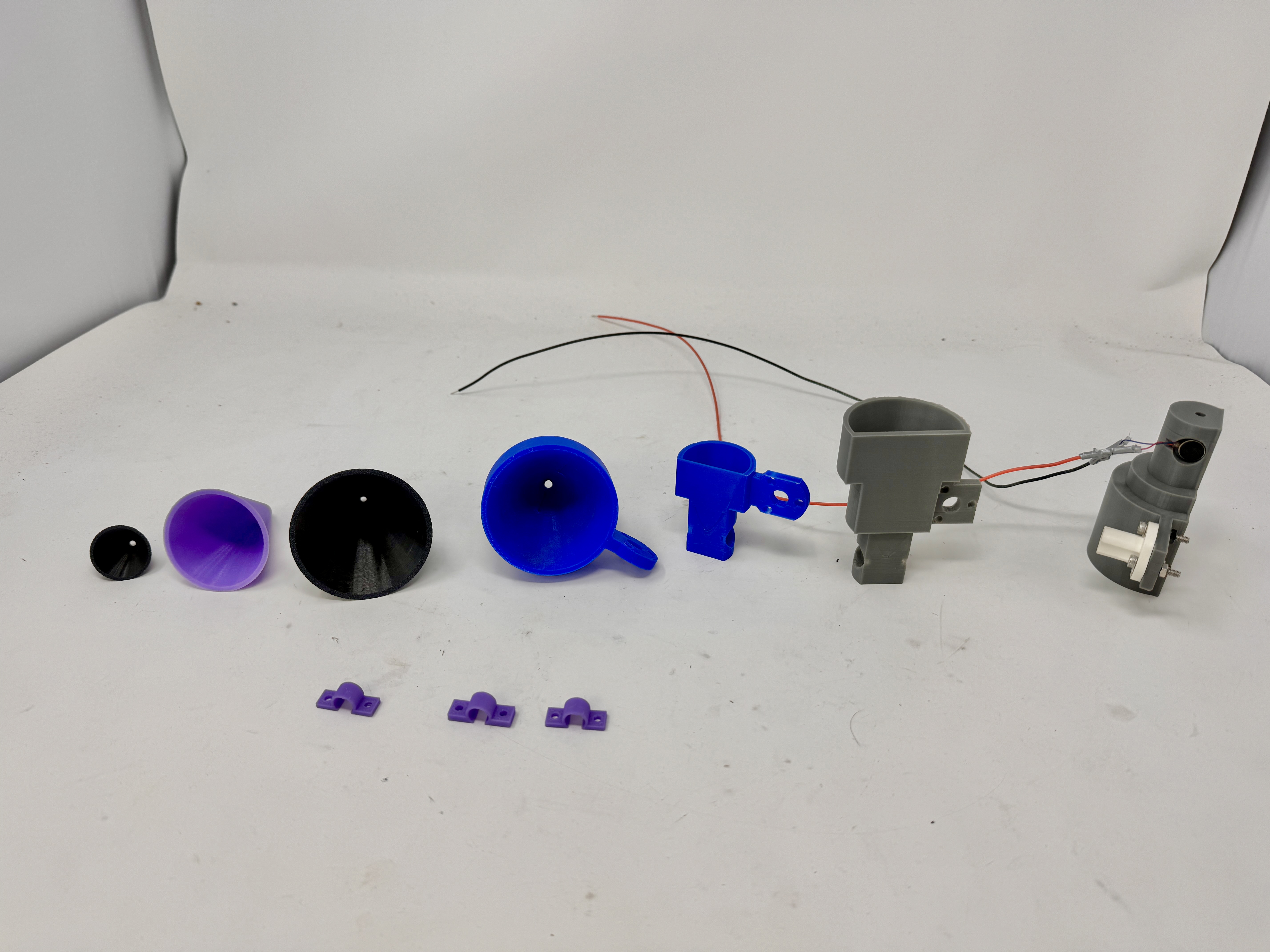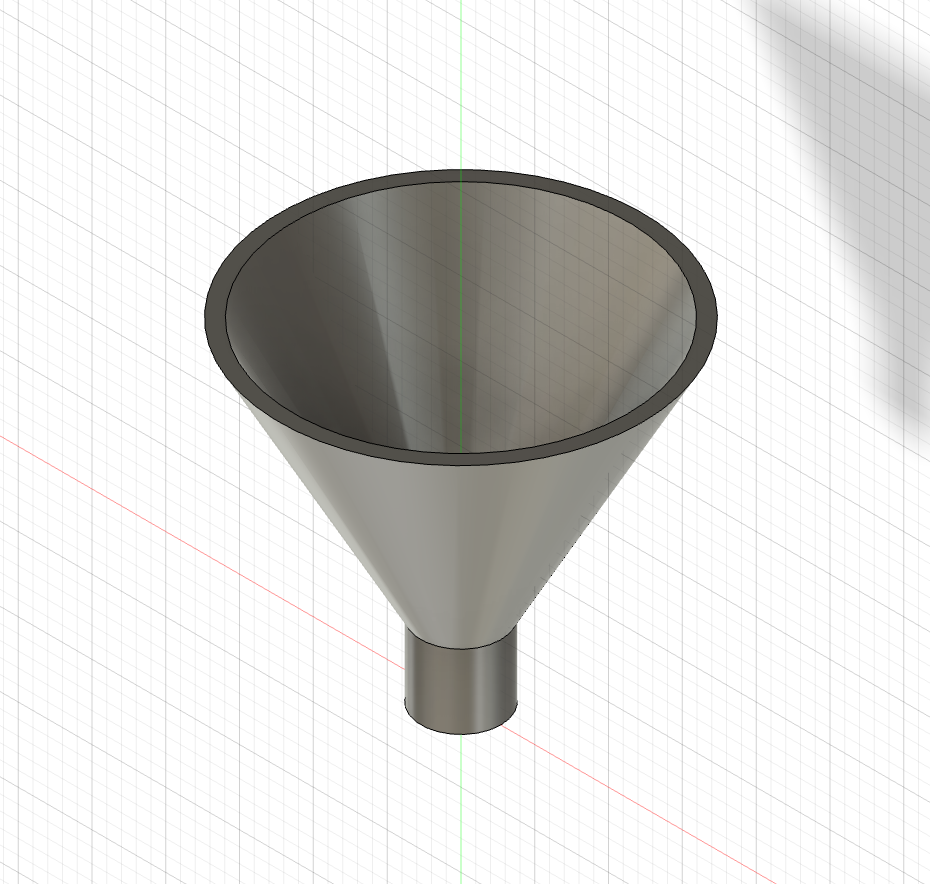 The end effector needed to hold cinnamon, not deposit cinnamon when moving from position to position, and deposit cinnamon in the tightest line possible when we want it to. Our initial thought was a cone, and we didn't have cinnamon, so we prototyped using laminating paper rolled into a cone held together with tape that we could vary to change the hole size and corn starch in lieu of cinnamon. After some extremely messy testing, we found a hole size that when it was tapped, corn starch would be deposited and it wouldn't otherwise. To automate this tapping, we thought to use an eccentric motor, but that caused corn starch to fly everywhere, and then we found little vibrating motors that worked great. We could plug them directly into 3V3 and GND, hold it up to the cone, and it would vibrate out corn starch. After taking some measurements, we wanted to make a more official looking end effector prototype, so we designed a tiny little cone that could be printed in 8 minutes.