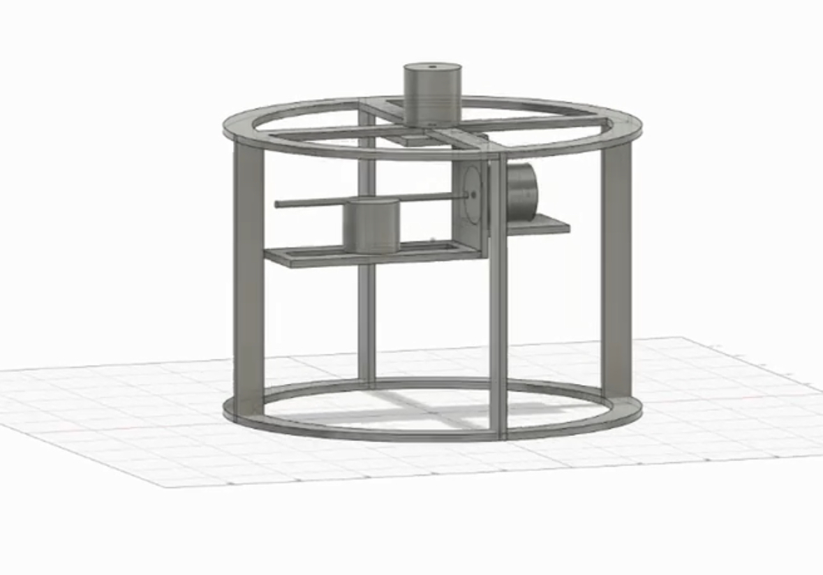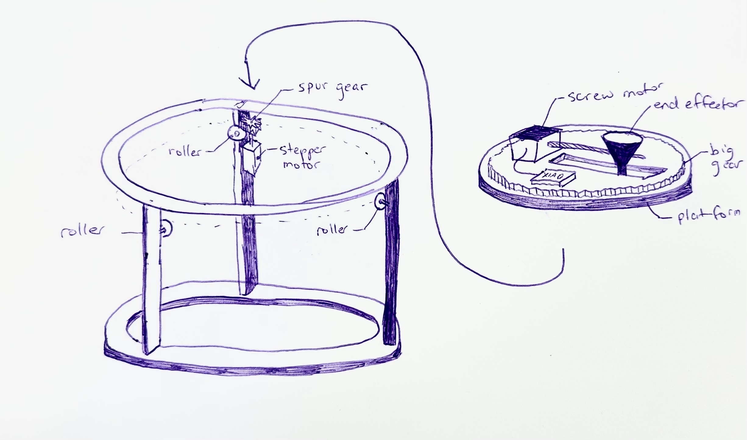 For this daunting assignment, our group got started with a suggestion from Wyatt who wanted to capitalize on the fact that his partner is a pastry chef - he suggested that we make a machine that can draw using cinnamon to decorate a cake or a coffee. Everyone was onboard with the idea - it seemed like a cool and unique take on the drawing machine assignment - but we didn't even know where to start. We began brainstorming some basics of the project - What gantry system are we going to use? How will we deposit the cinnamon? How is this device going to fit over top of a cake or coffee? In this process, we decided that we wanted to try out using polar coordinates instead of the typical, and available, cartesian coordinate gantries. We wanted to try this for a couple reasons. First, it would be pretty cool to just get something using an entirely different coordinate system working and functional - yes, it's still effectively the same process, but now instead of moving X and Y, we are moving R and Theta, which I think is pretty sick. Second, polar coordinates are conducive to round things, much like a cup of coffee or a (non-sheet) cake. These round objects are easier to draw over if we are drawing using circles. Third, which is kind of an added bonus, is that completing the assignment of drawing a circle with a fixed radius seemed much easier with polar coordinates than cartesian ones. With this in mind, we got to modelling our first iteration of what the project might look like, just so that we were all on the same page.