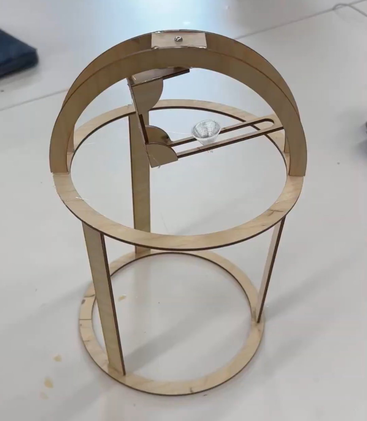 While our early prototypes were crude, we rapidly learned and developed. We started with cardstock for an easily iterable material, before moving to lasercut wood for a more sturdy build. We quickly realized that the current way of holding the end effector, with it dangling from the gantry, was not going to be sturdy enough to hold everything the way that it needed to, it was too flimsy and couldn't attach very securely. We tried to solve this problem by making more surface area touching the gantry to hold it in place more securely, but we realized that we needed a completely different approach to this.